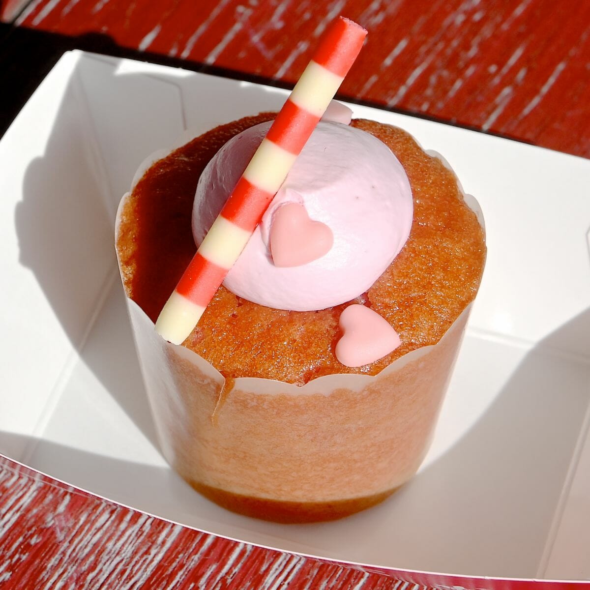 ほどよい甘さのチェリーマフィンには、赤と白のスティック型チョコレートとピンク色のハート型チョコレートがトッピングされています☆