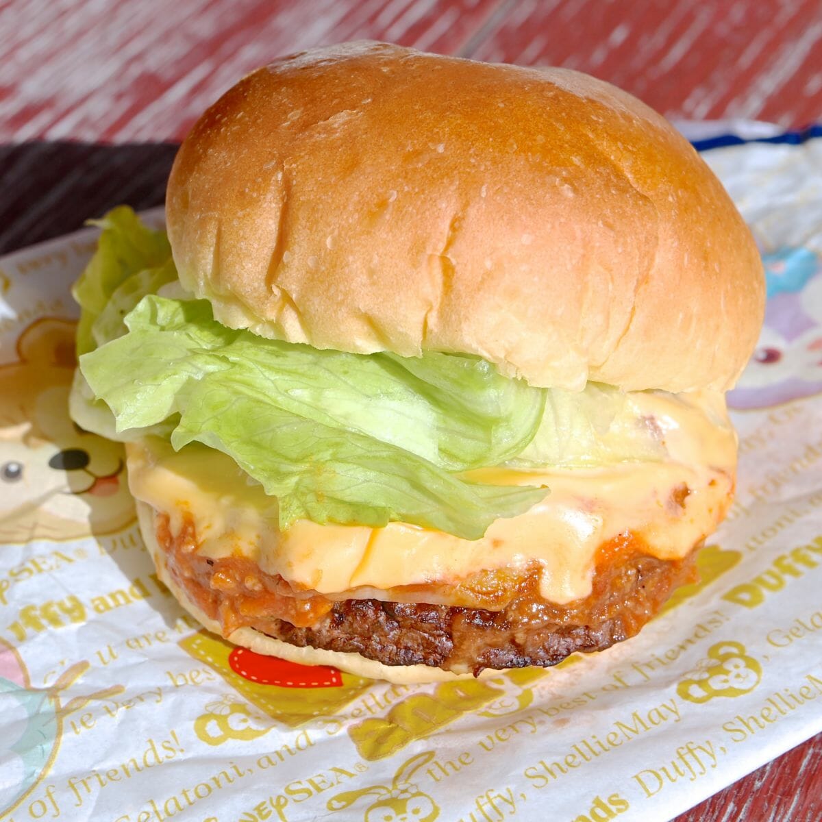ミートソース、チーズがたっぷり入った「ベーコンチーズバーガー」