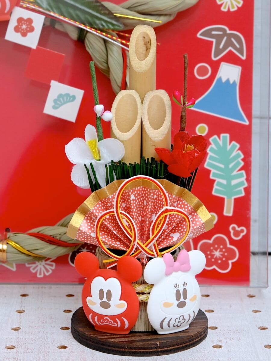 ミッキーマウスとミニーマウスモチーフの紅白だるまがかわいい門松。