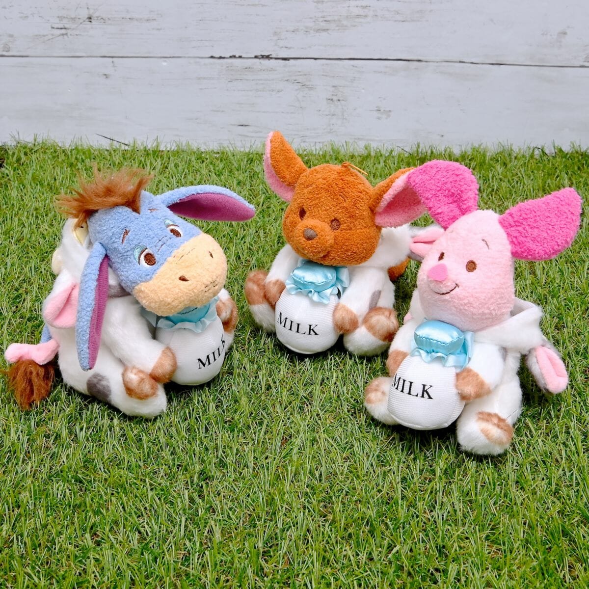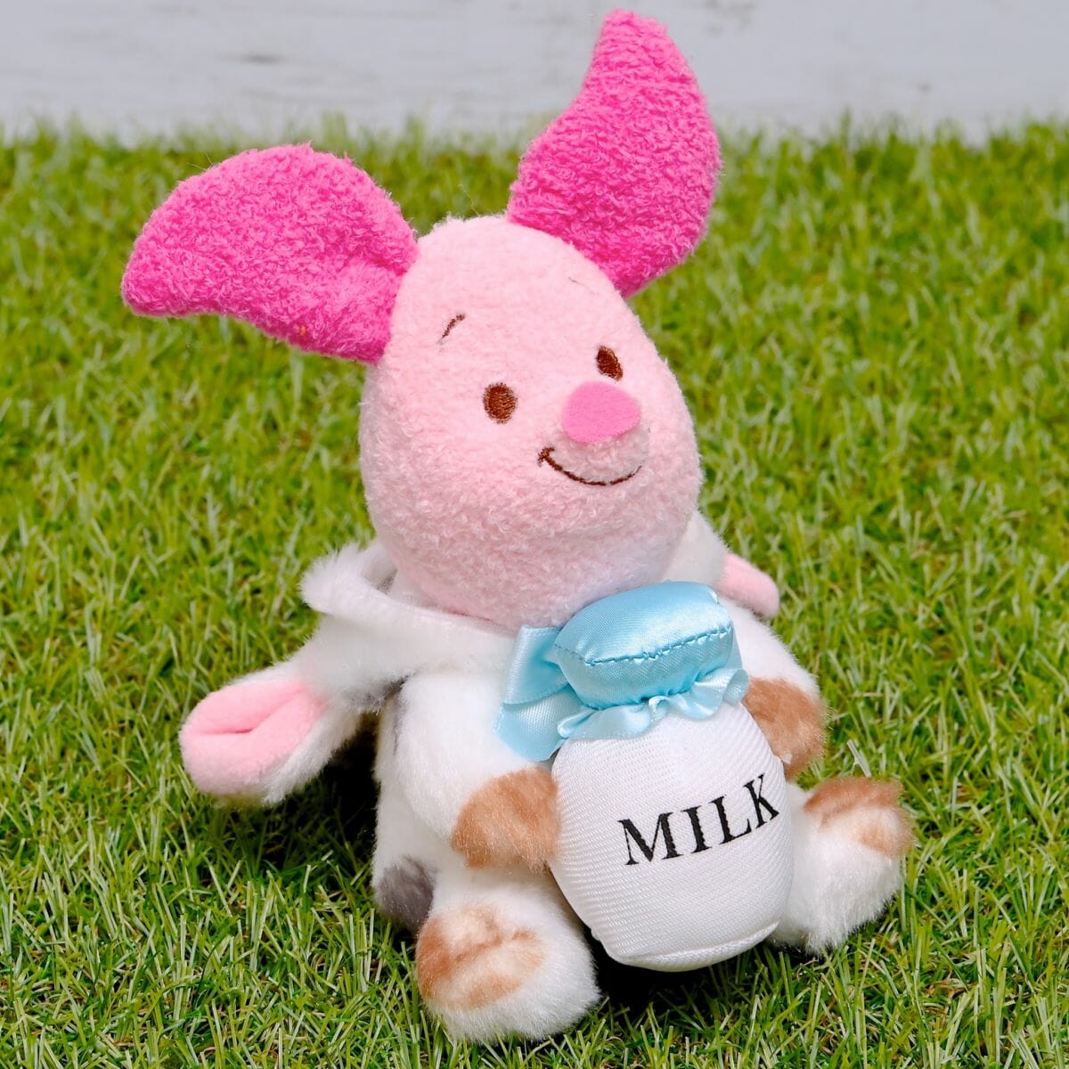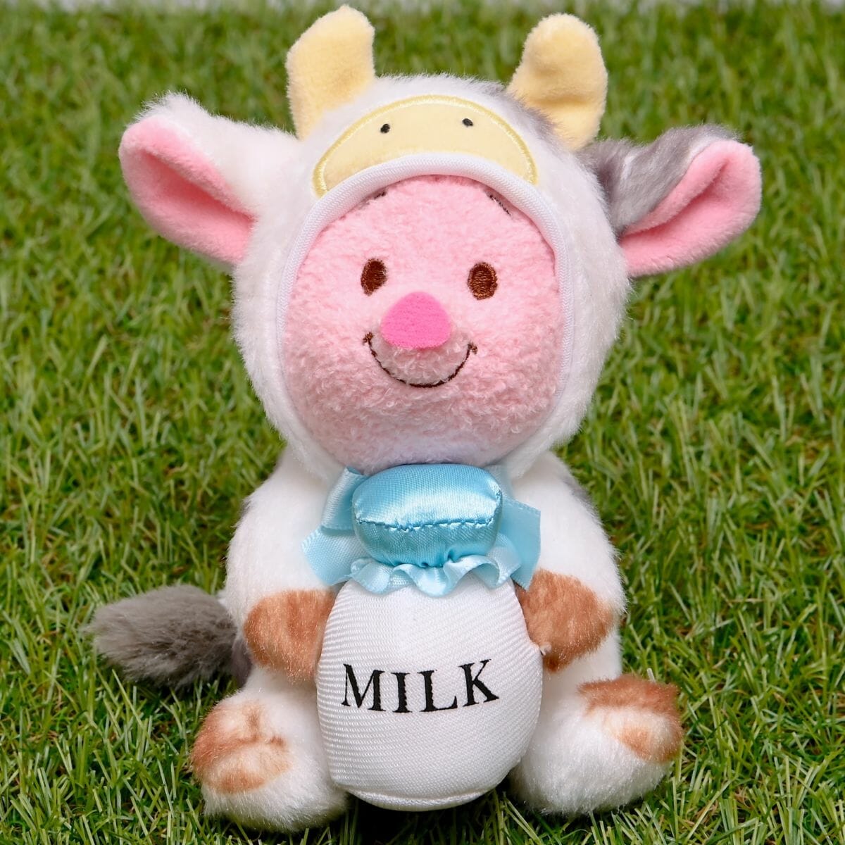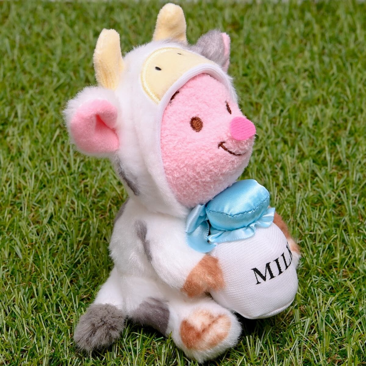 ウシのコスチュームを着たピグレットのぬいぐるみ。