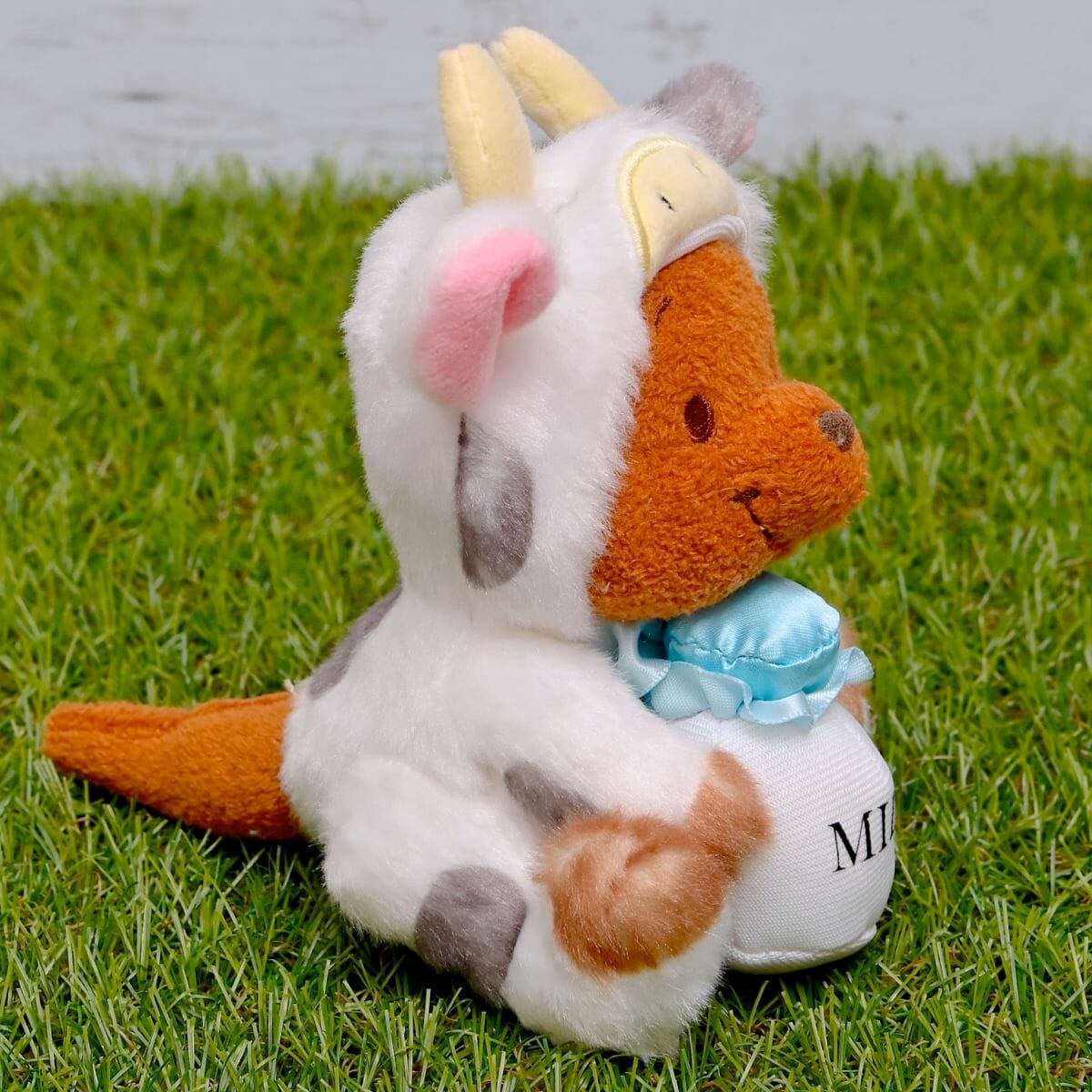 ウシになりきったカンガルーのルーのぬいぐるみ。