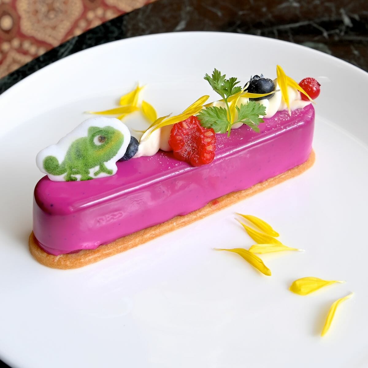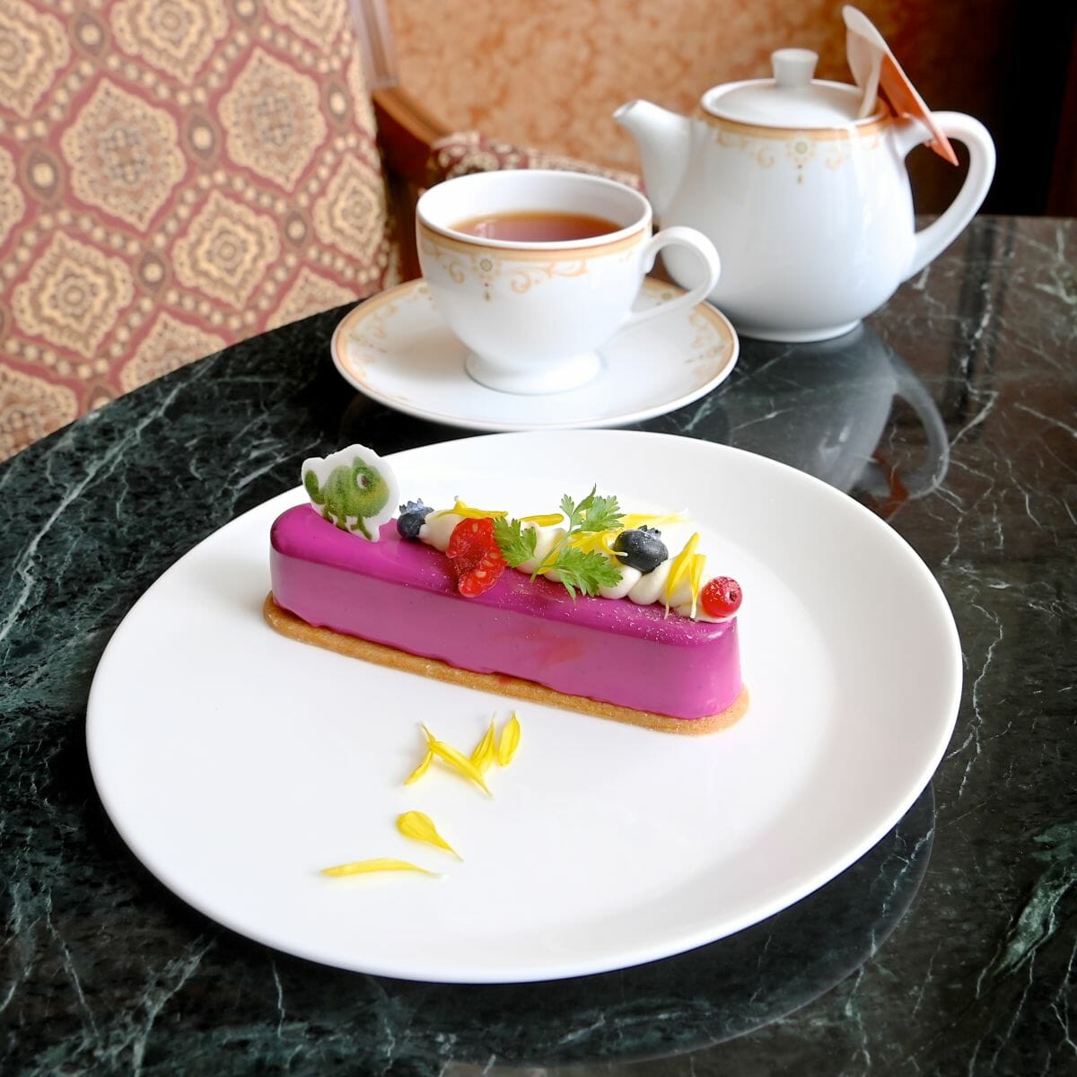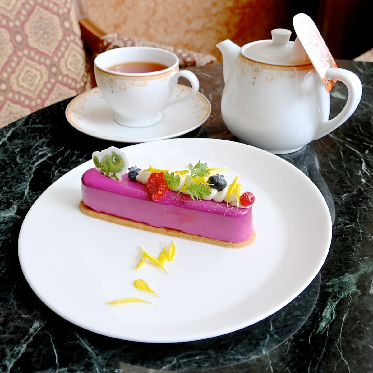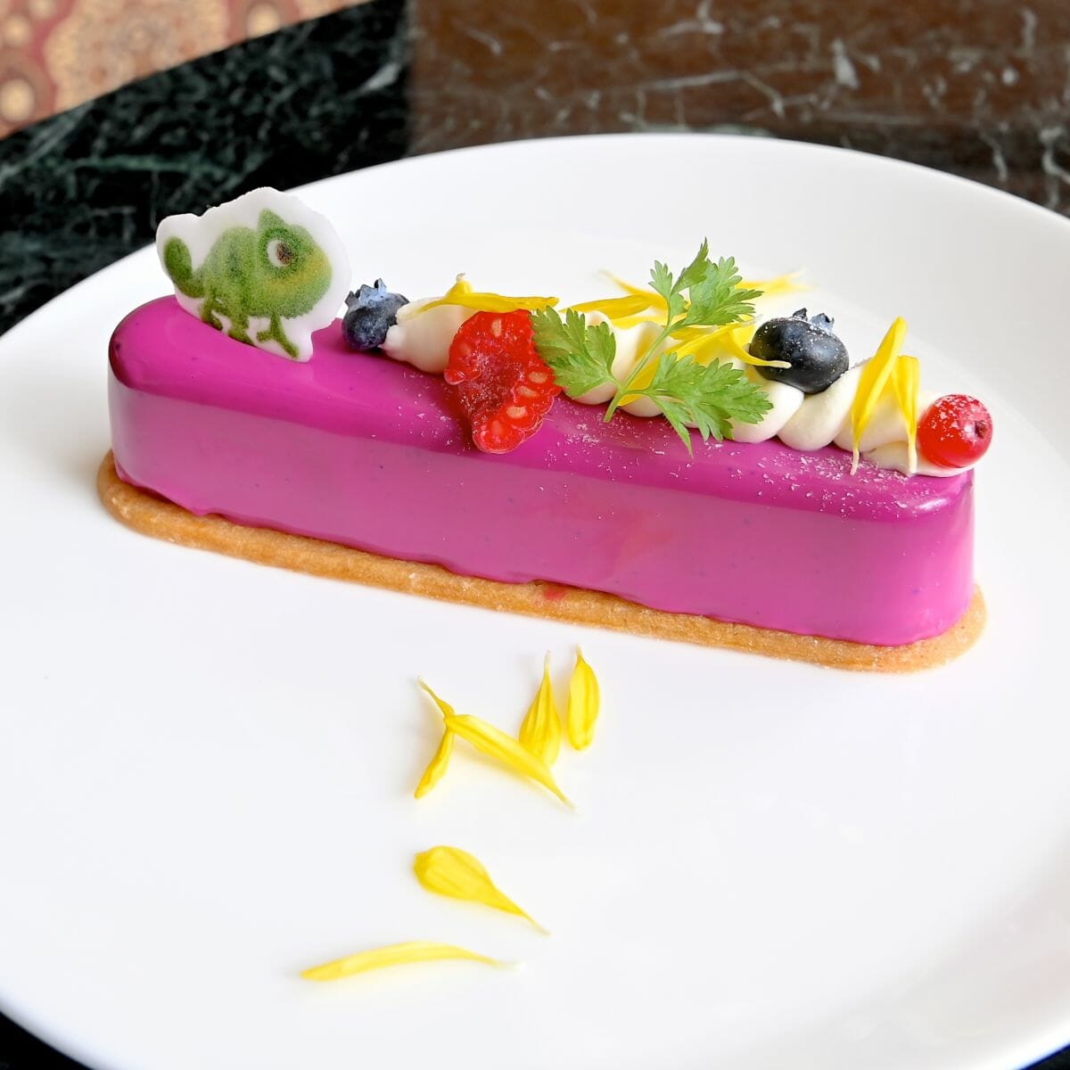 軽やかになびく髪をイメージしたレモンクリーム入りのホイップクリーム、ラプンツェルの金髪をイメージした菊の花、親友のパスカルがトッピングされています!