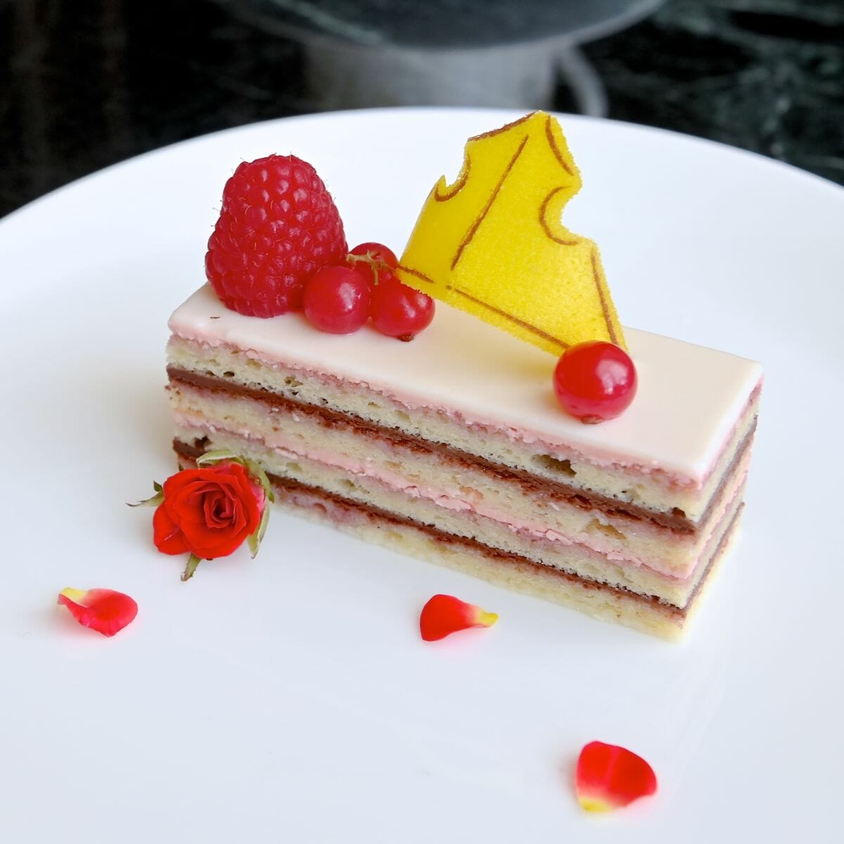 『眠れる森の美女』に登場する輝く金髪、バラのように赤いくちびるを持つ美しいプリンセス「オーロラ姫」モチーフケーキは、チョコレートとベリーのオペラ。