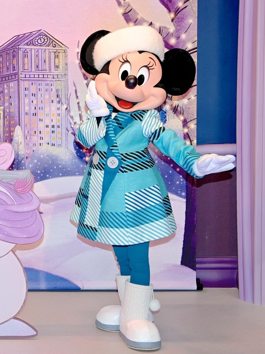 ファー生地の帽子、ラメ感がきれいなターコイズブルーを基調にチェック柄がデザインされたコート、ホワイトのブーツ姿のファッショナブルなミニーマウス!