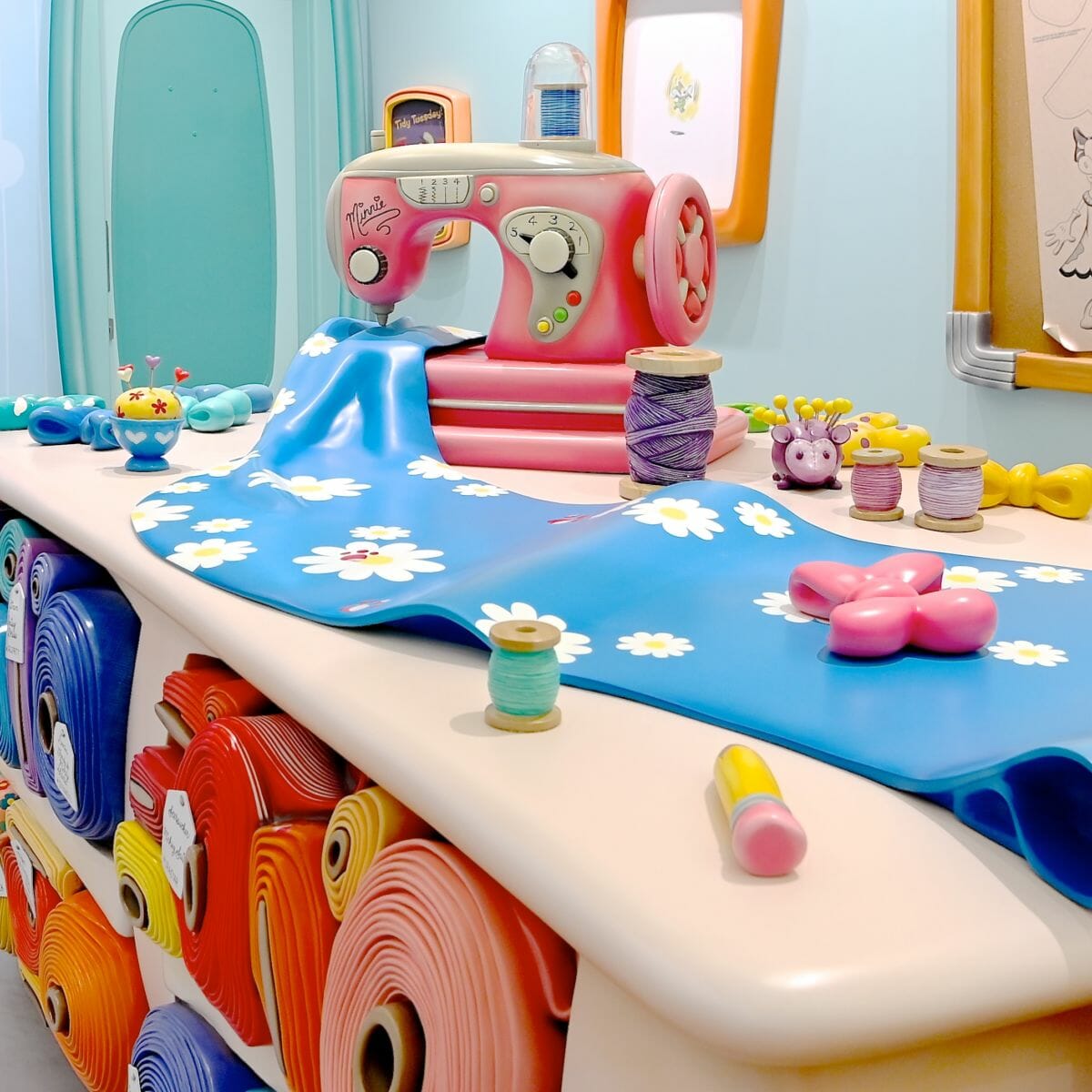 ミニーマウスのサインが入ったミシンや縫製に使っている道具や材料を見ることができます。