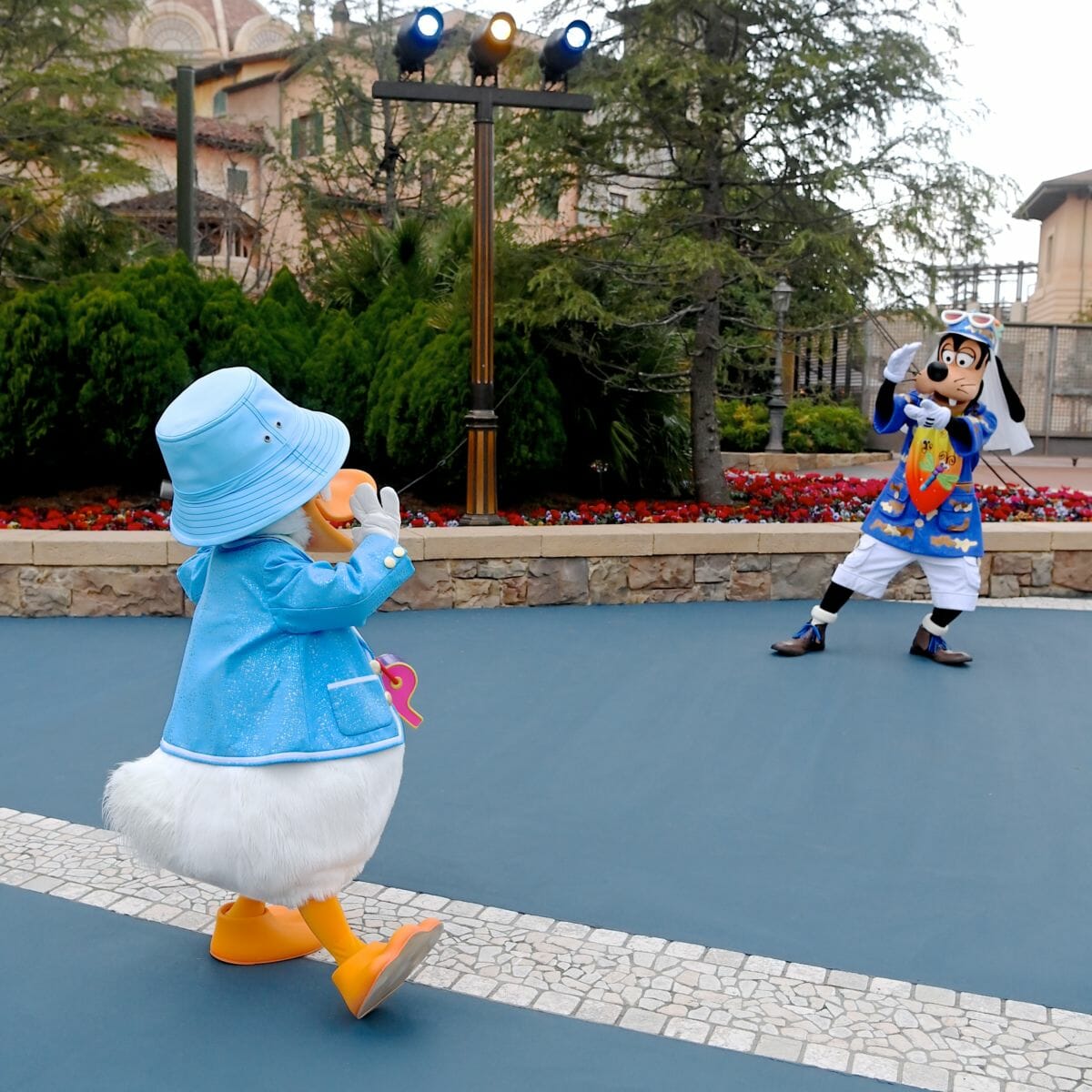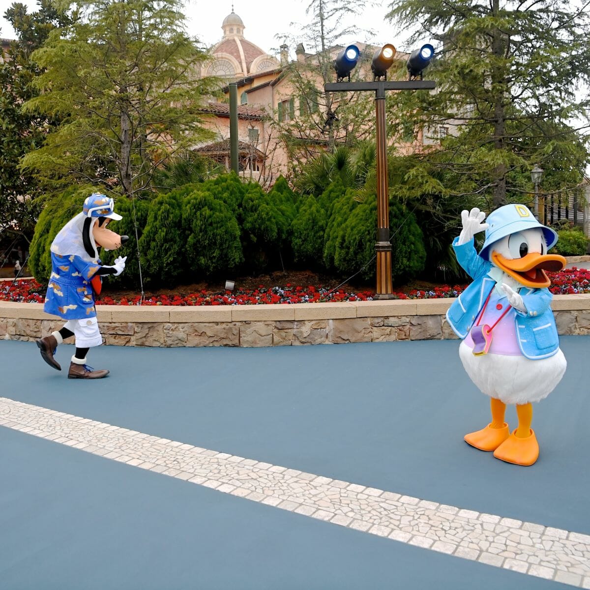 ステージを降りたドナルドダックとグーフィーはソーシャルディスタンスを保ちながらグリーティングを継続☆