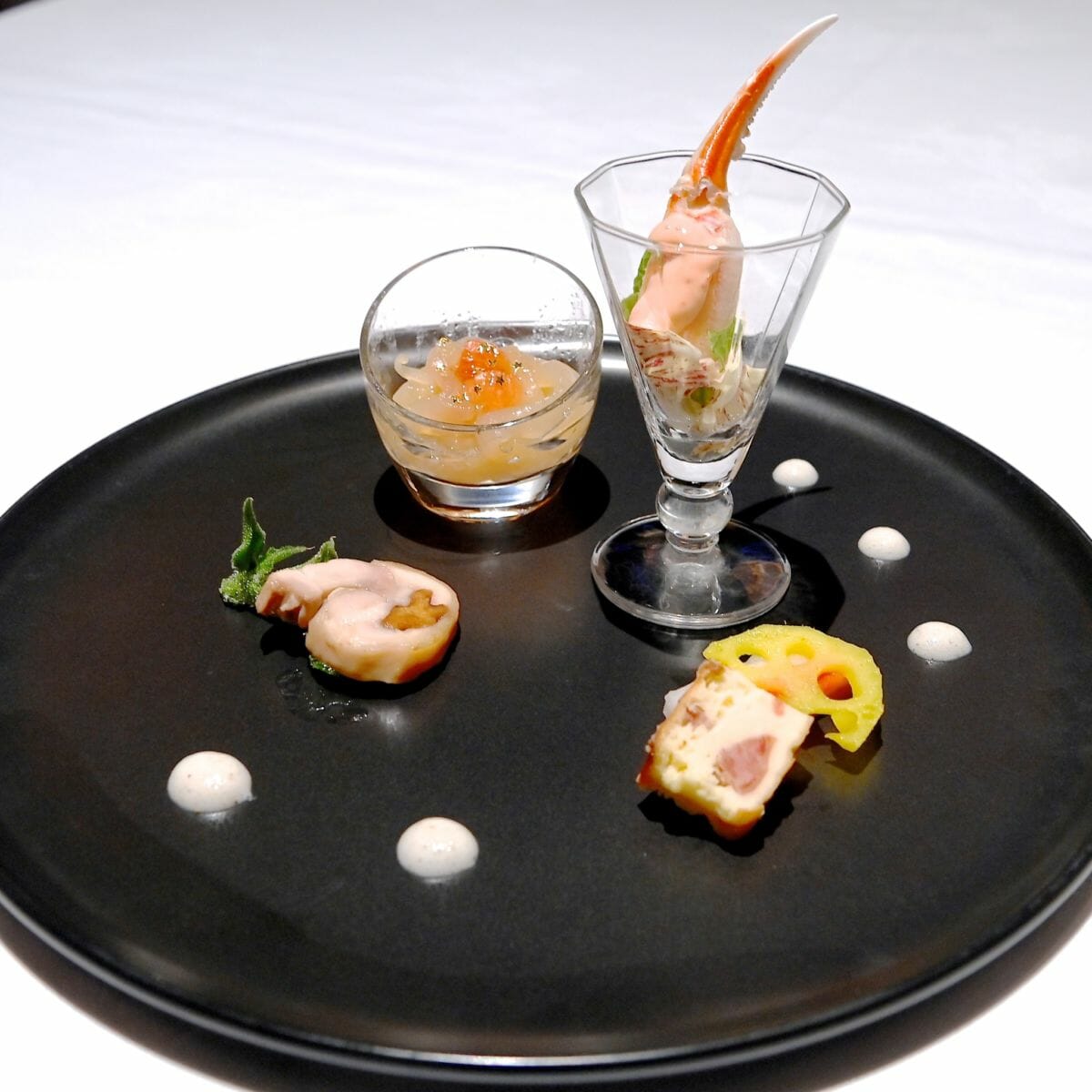 前菜の盛り合わせは、蟹の爪のサラダ仕立て、星の金粉がかかったクラゲの冷菜、くるみを詰めた鶏肉、れんこん、金華ハムとクリームチーズの寄せ物。