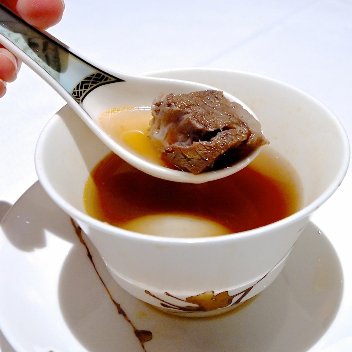 スープは、芳醇な牛ほほ肉と根菜入りの蒸しスープ。