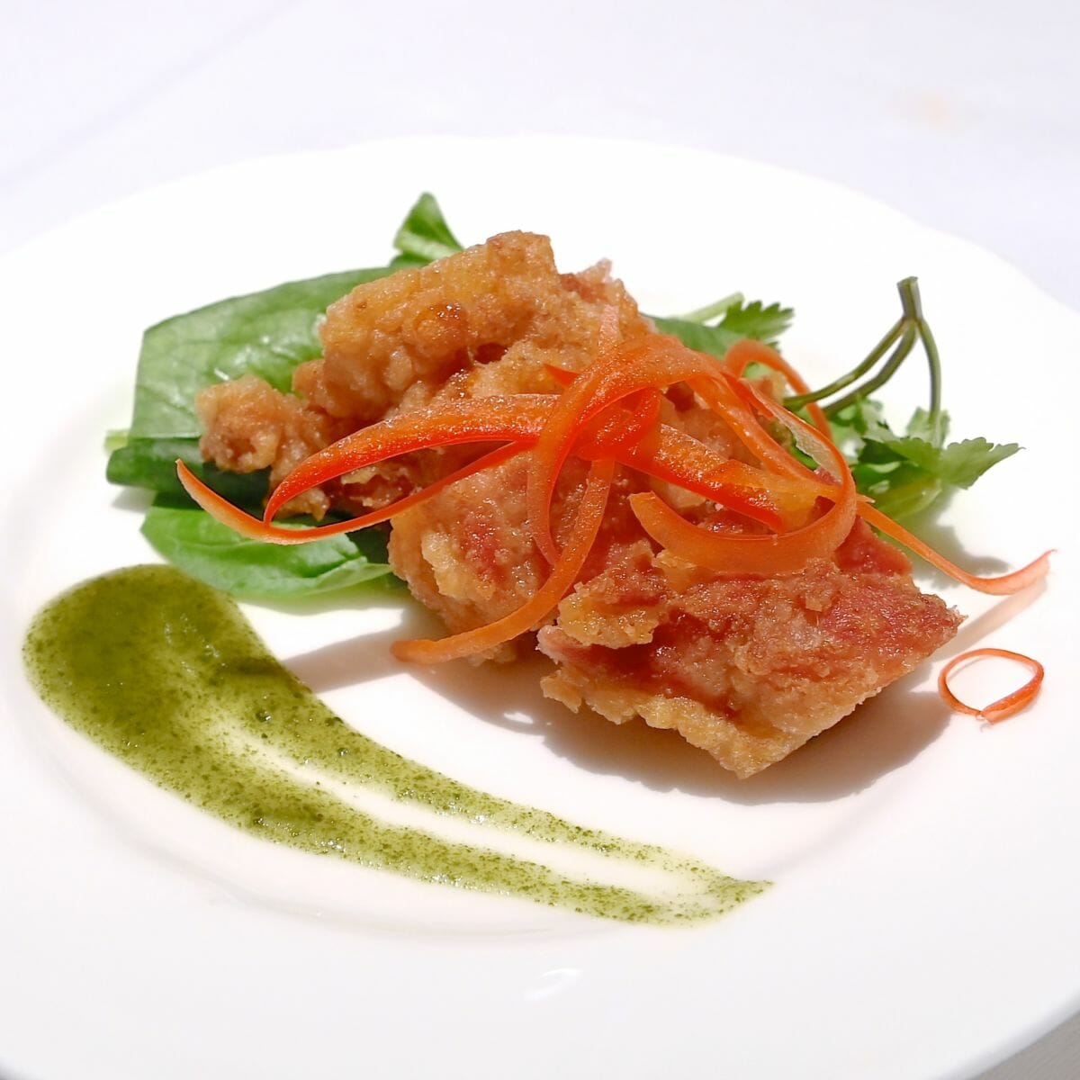 大山鶏の唐揚げ ほうれん草とパクチーのソース添え