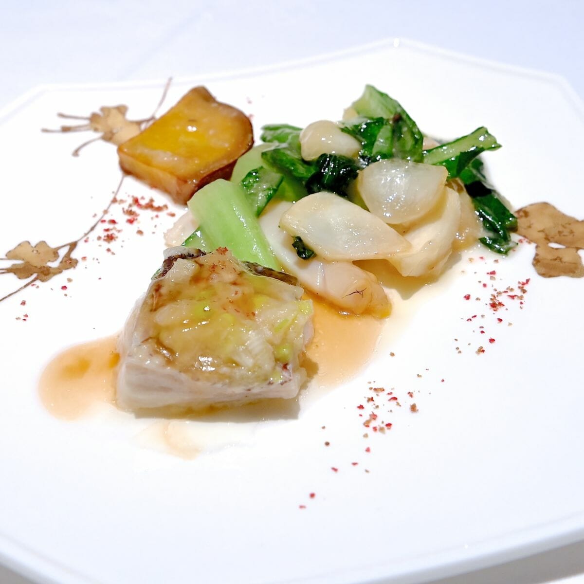 白身魚の葱生姜蒸しとつぶ貝と野菜の炒め
