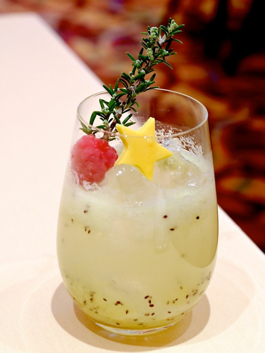 キウイフルーツ、パッションフルーツシロップ、アップルパイシロップ、クラブソーダ、フレッシュレモンジュース入り。