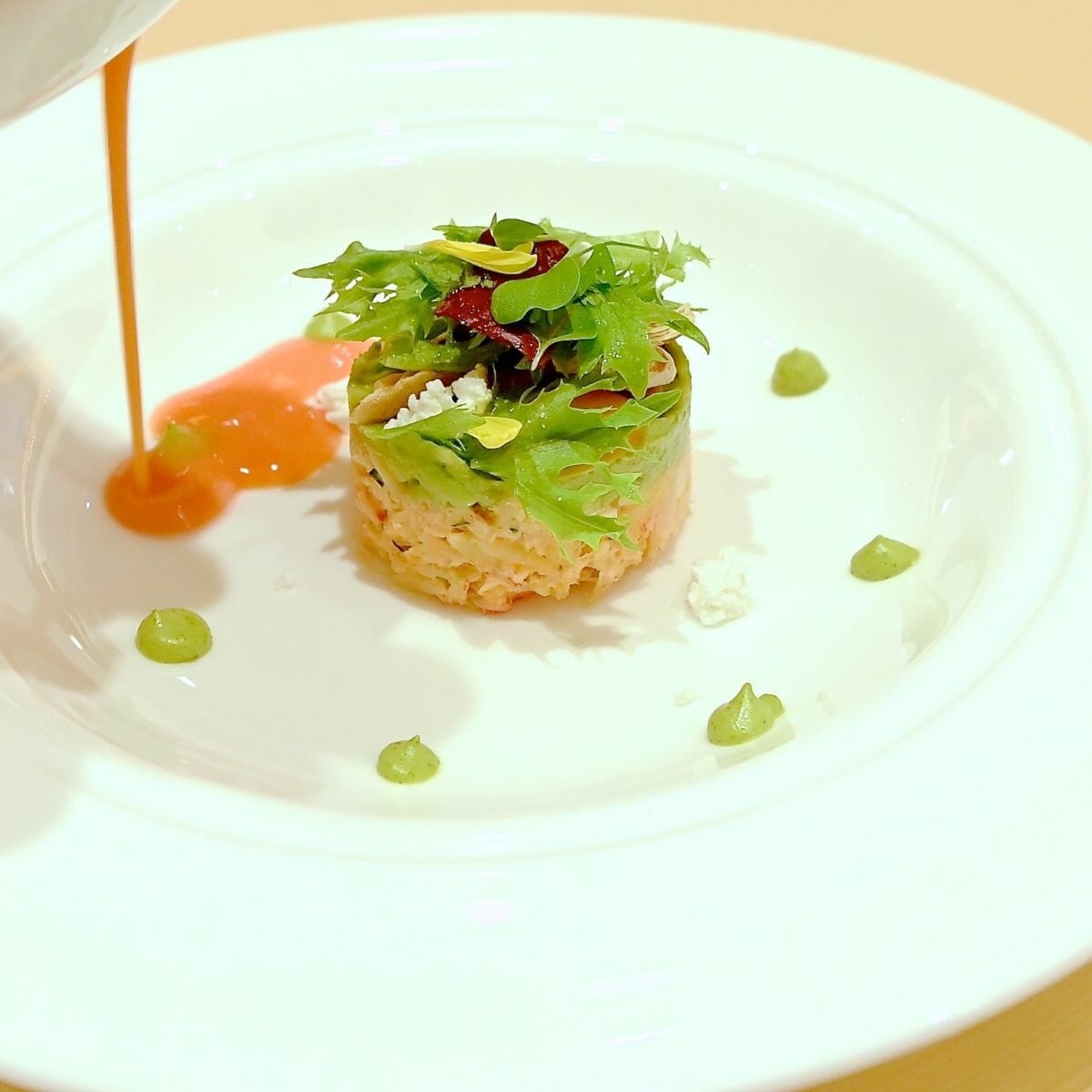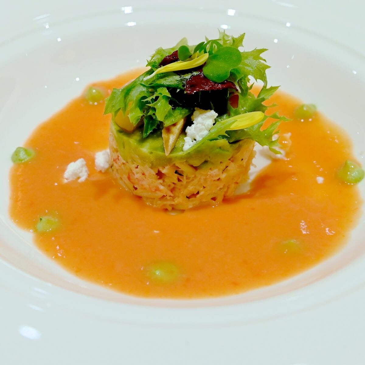 クラブミートとリゾーニのサラダ ライムのアクセント トマトと赤パプリカのソース1