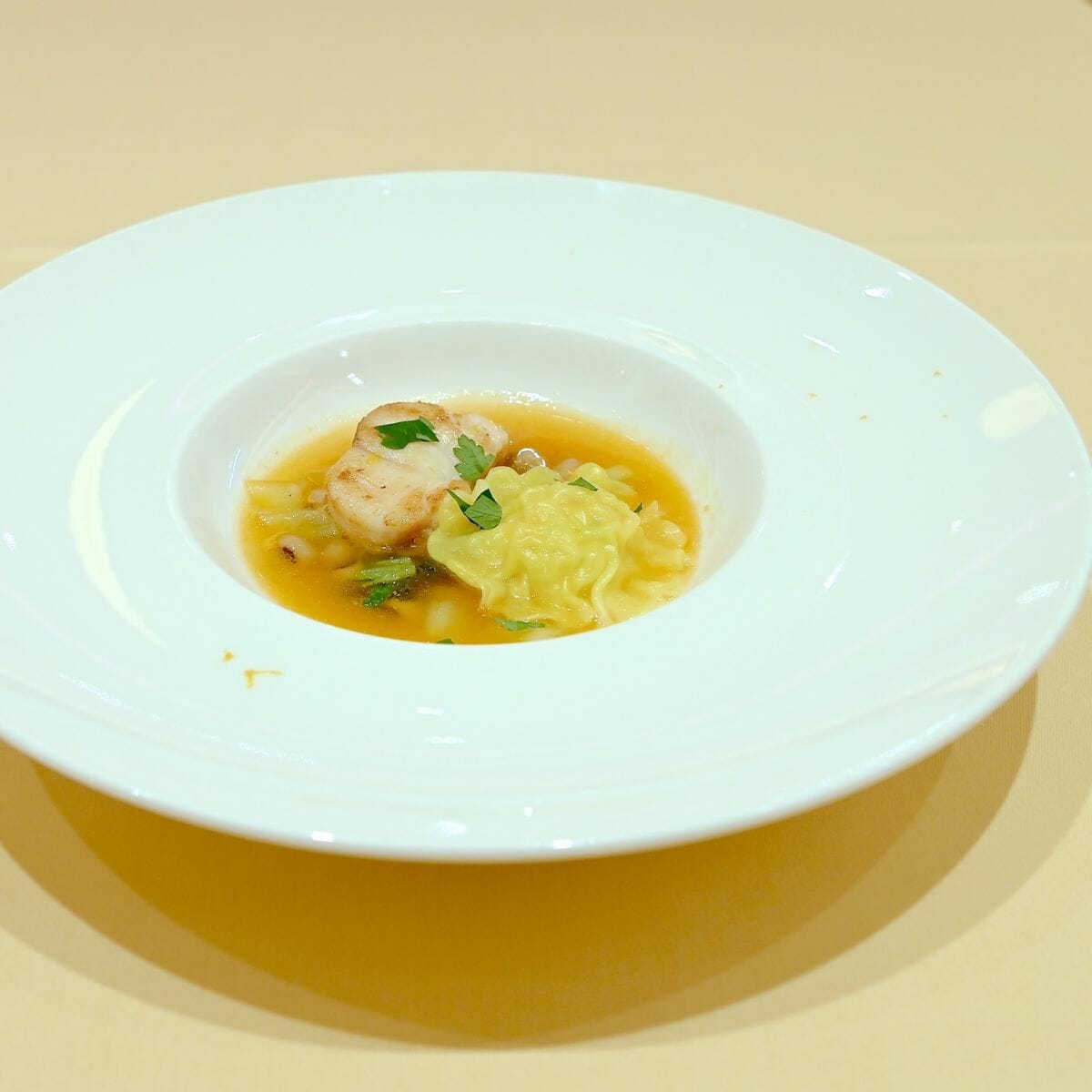 アンコウのポワレとオレンジ香る海老のラビオリ チョッピーノ仕立て アップ
