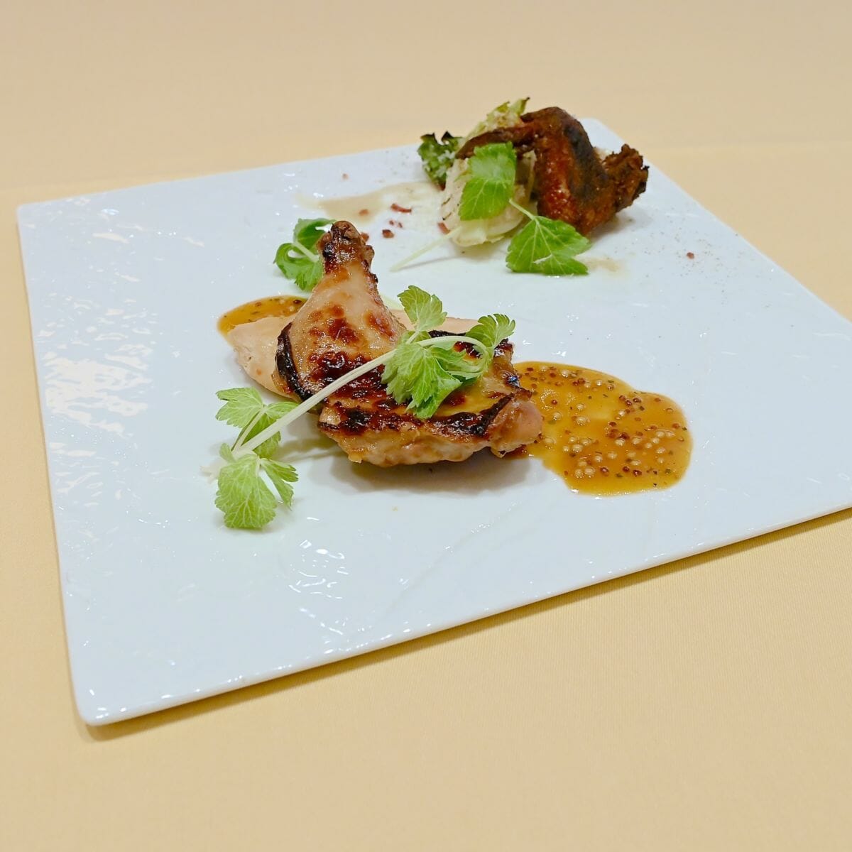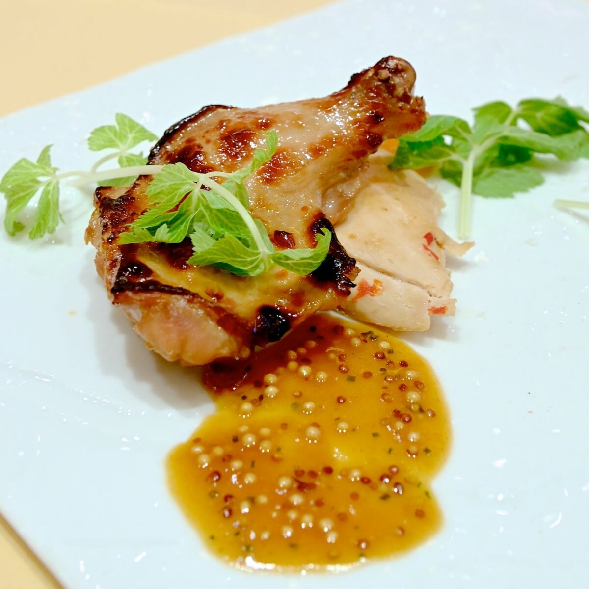 マリネしスチームされた胸肉とローストしたもも肉は、粒マスタードを使用したソースで。