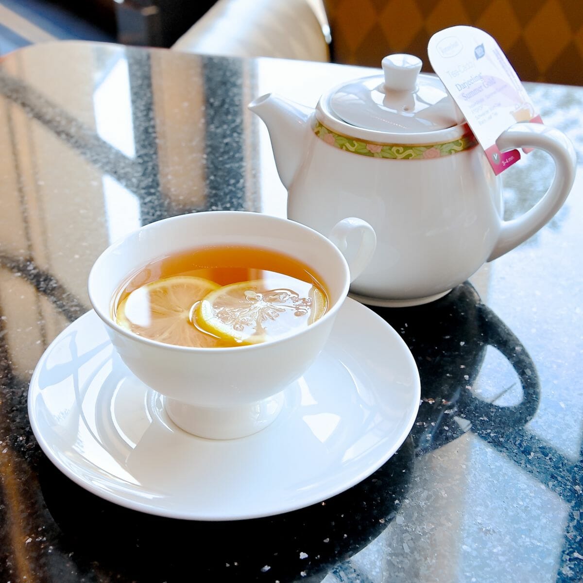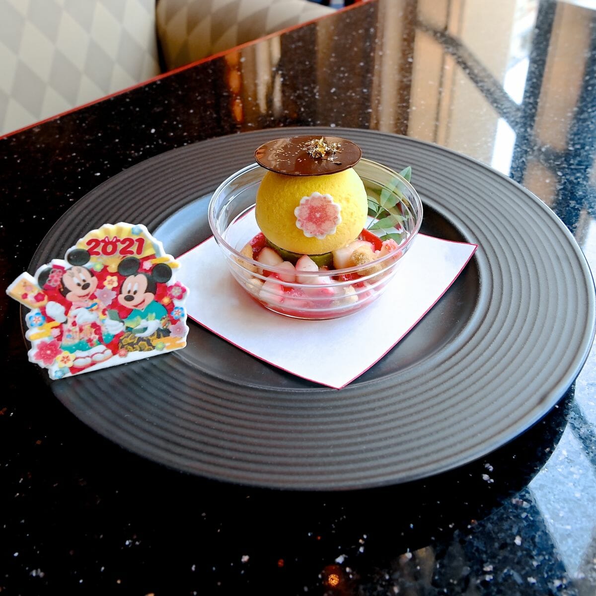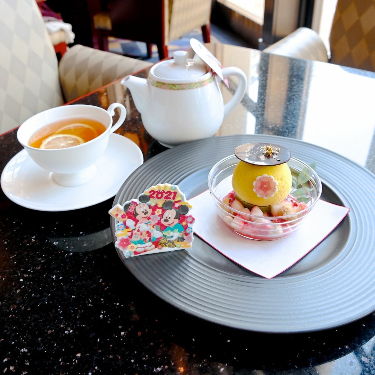 「東京ディズニーリゾートのお正月」に連動したケーキセットは、柚子のムースとコーヒーまたは紅茶のセットです☆