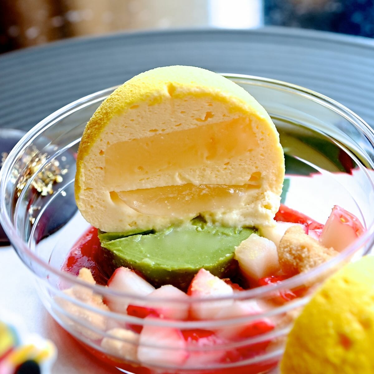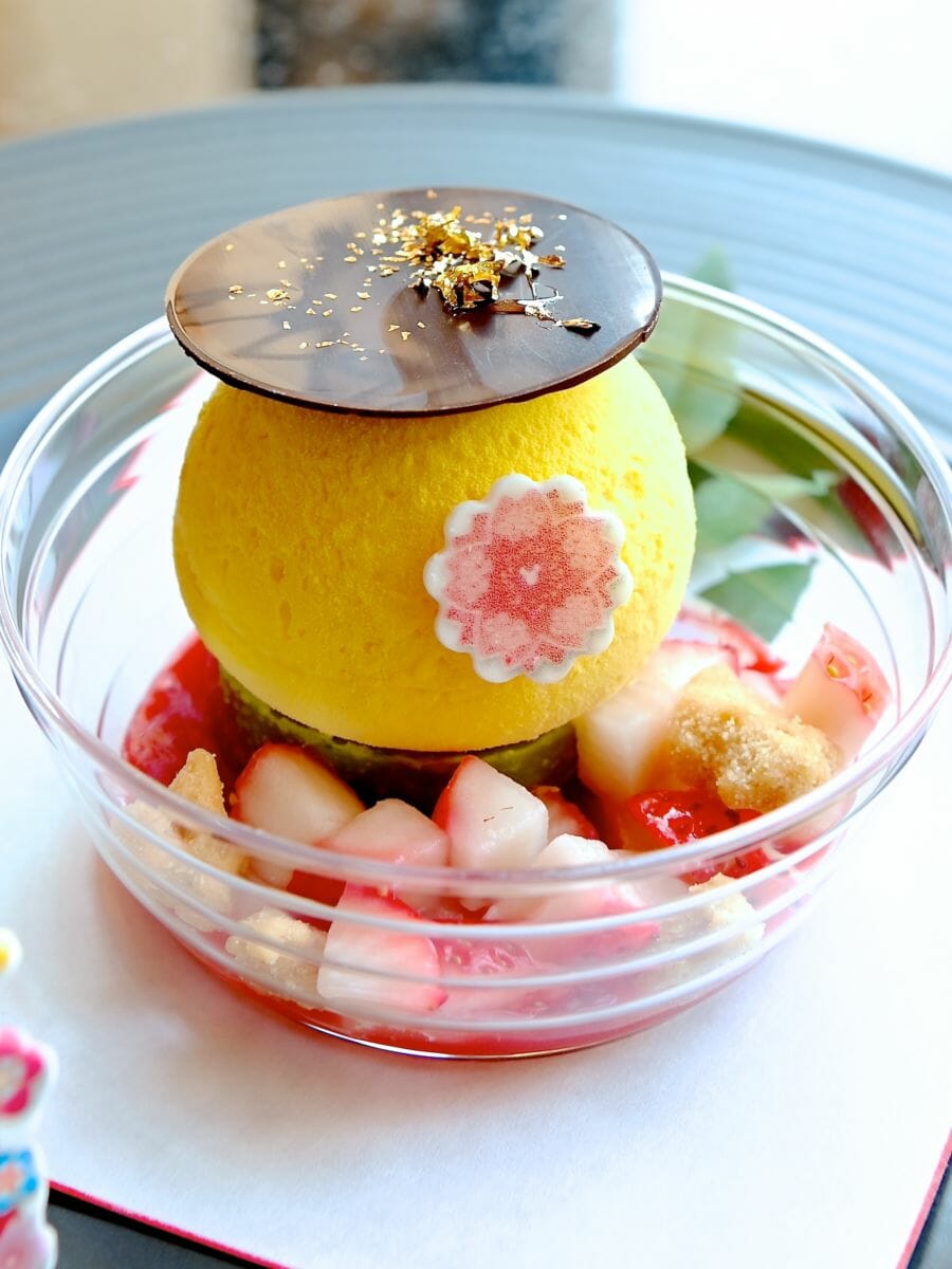 上品な柚子ムースと濃厚な抹茶のガナッシュ、いちごソース、クランブルなどバランスがとれた最後までしっかり美味しいデザートになっています☆