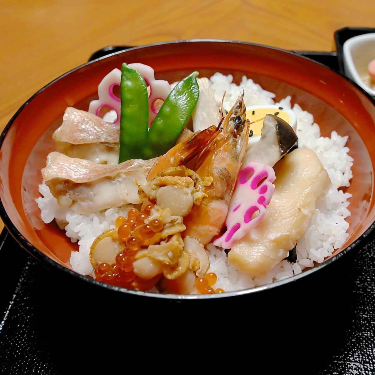 海老、カラスガレイ、ホタテ、いくら、赤魚などの海の幸の他、鶏肉、エリンギ、たまご、絹さやなどが色鮮やかにトッピングされた豪華な丼です☆