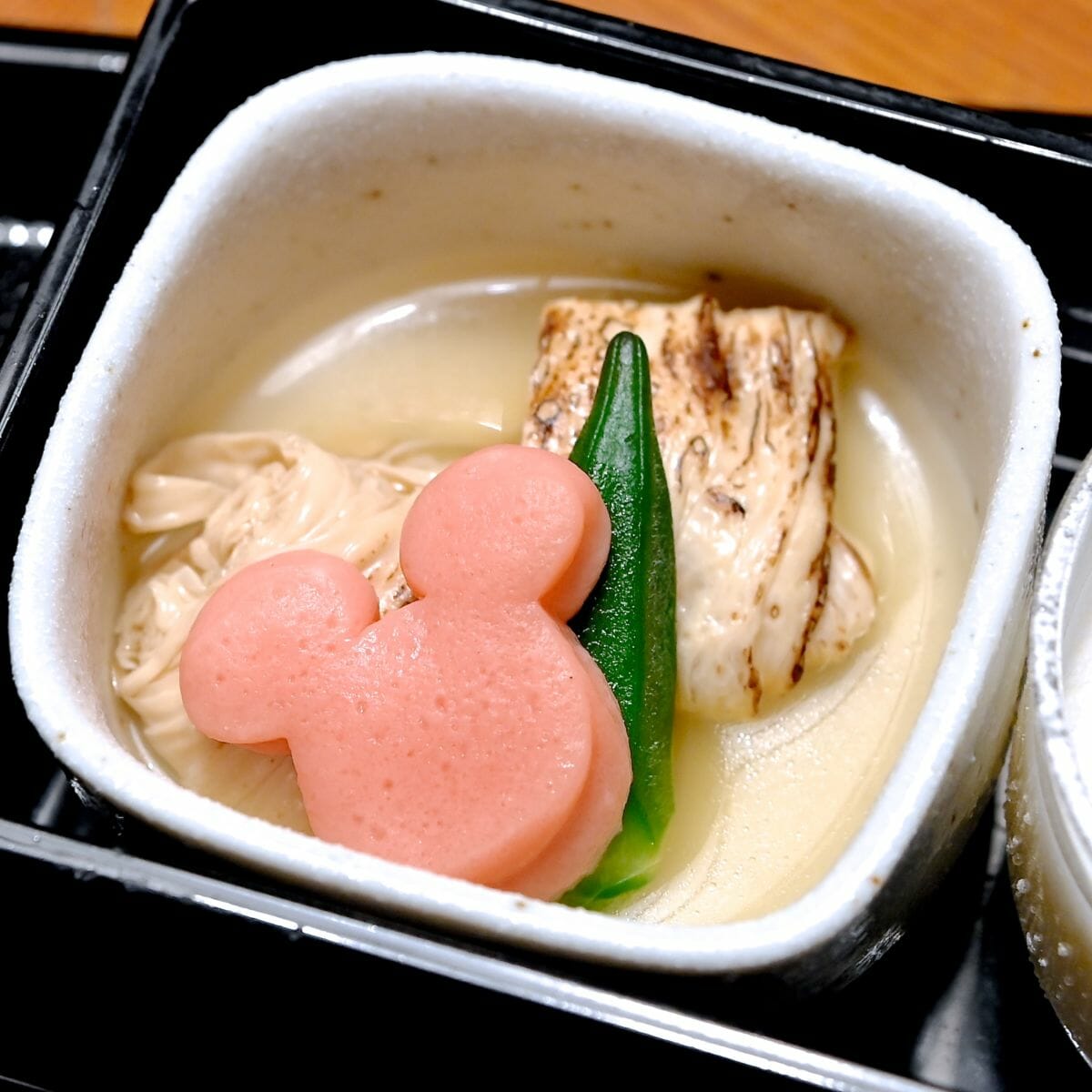 焼き湯葉、オクラ、ミッキーシェイプのかまぼこの炊合せ。