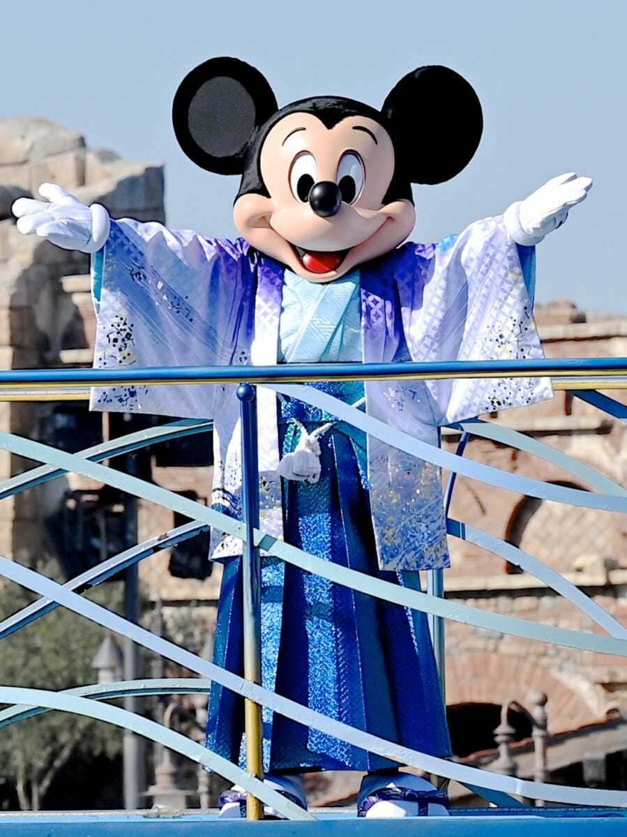 ミッキーマウスはキラキラと輝く紫の羽織と青色の袴姿で登場!