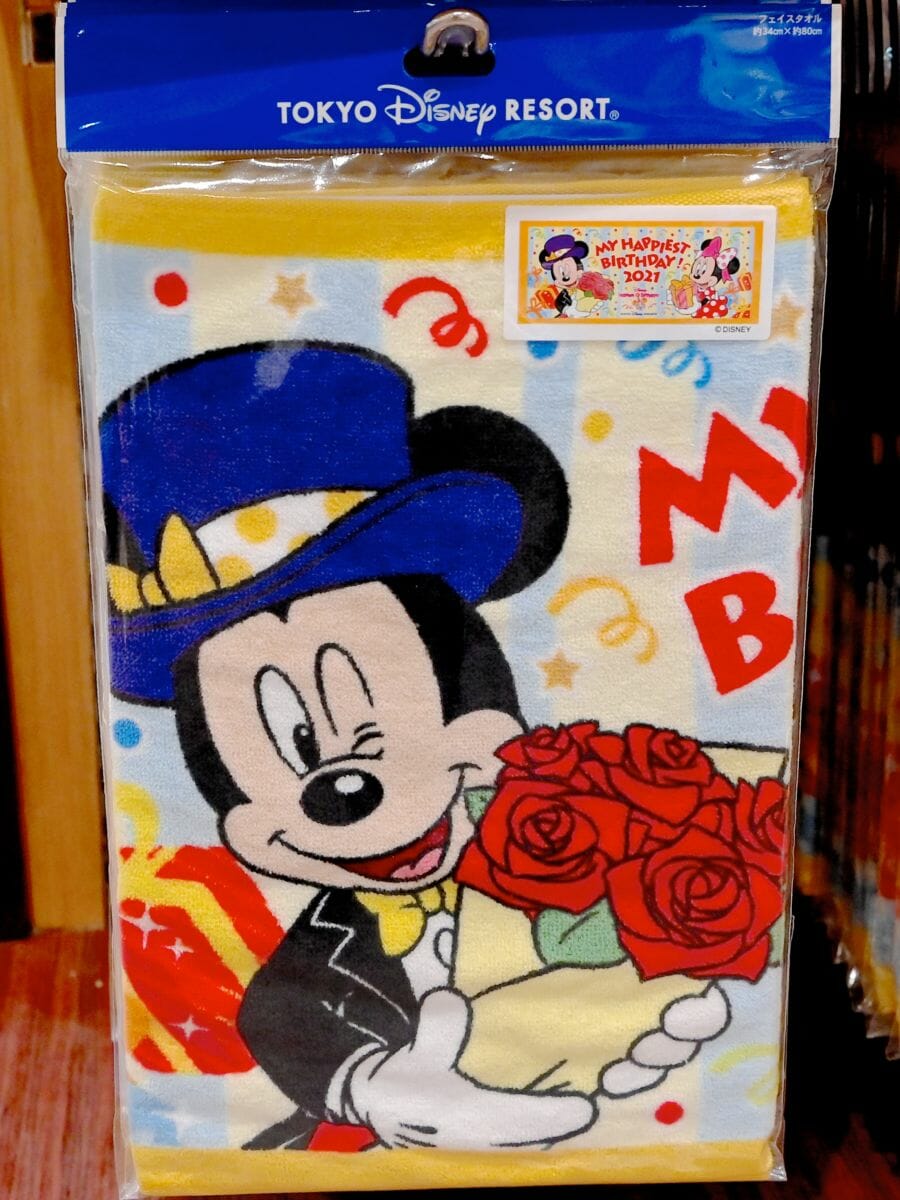 中央に「MY HAPPIEST BIRTHDAY!2021」の文字、サイドにミッキーマウスとミニーマウスが描かれているカラフルかわいいフェイスタオル☆