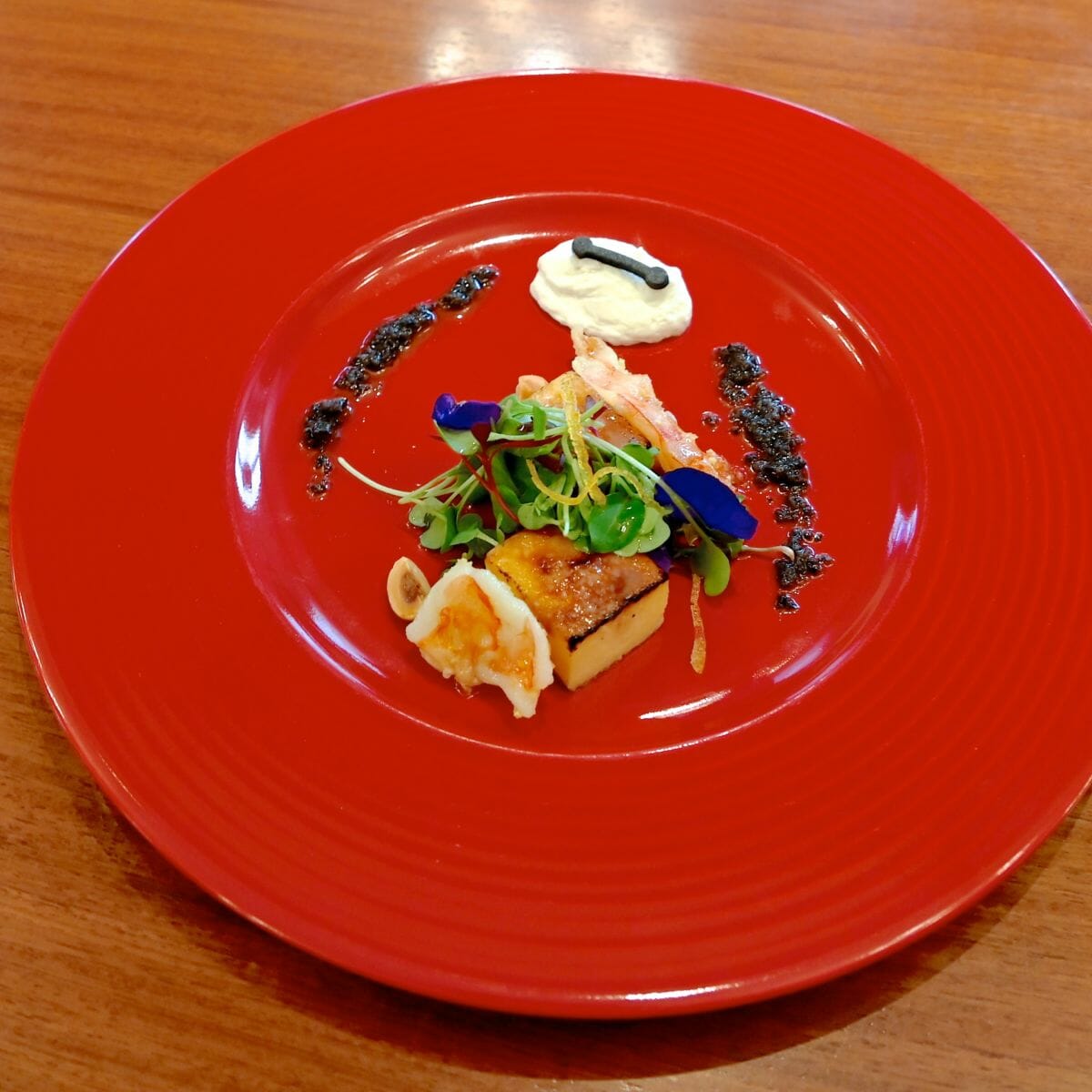 前菜は海老のマリネと、チーズのコクと旨みが楽しめるスフォルマート(洋風茶碗蒸し)