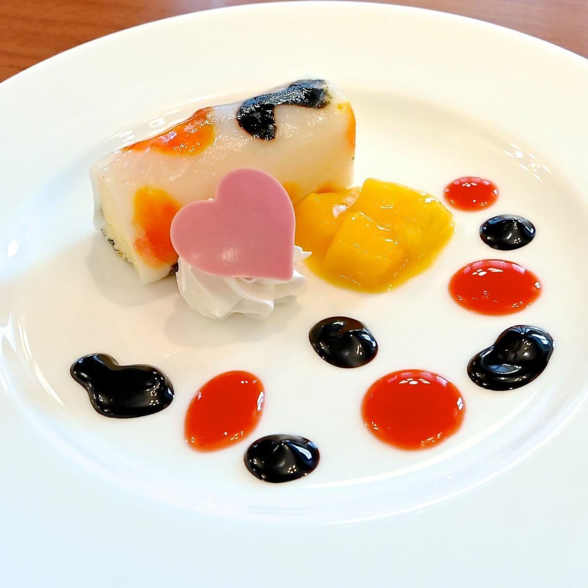 もちもちな求肥で巻かれたホワイトチョコレートムースや周りには「モチ」の模様にあわせ、チョコレートとベリーのソースでデコレーションされています。