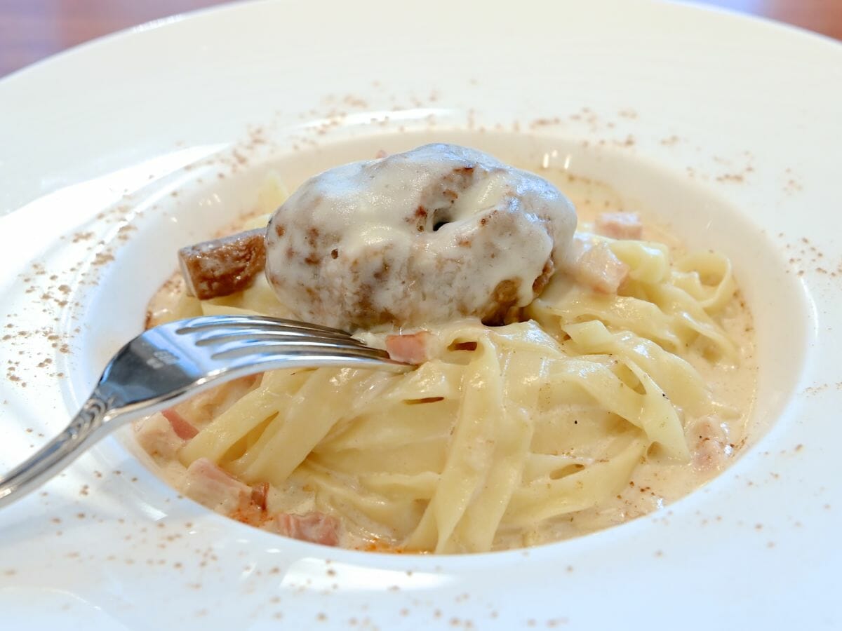 ポルチーニが濃厚に香るクリームとトマトソースでいただくタリアテッレ(幅広パスタ)