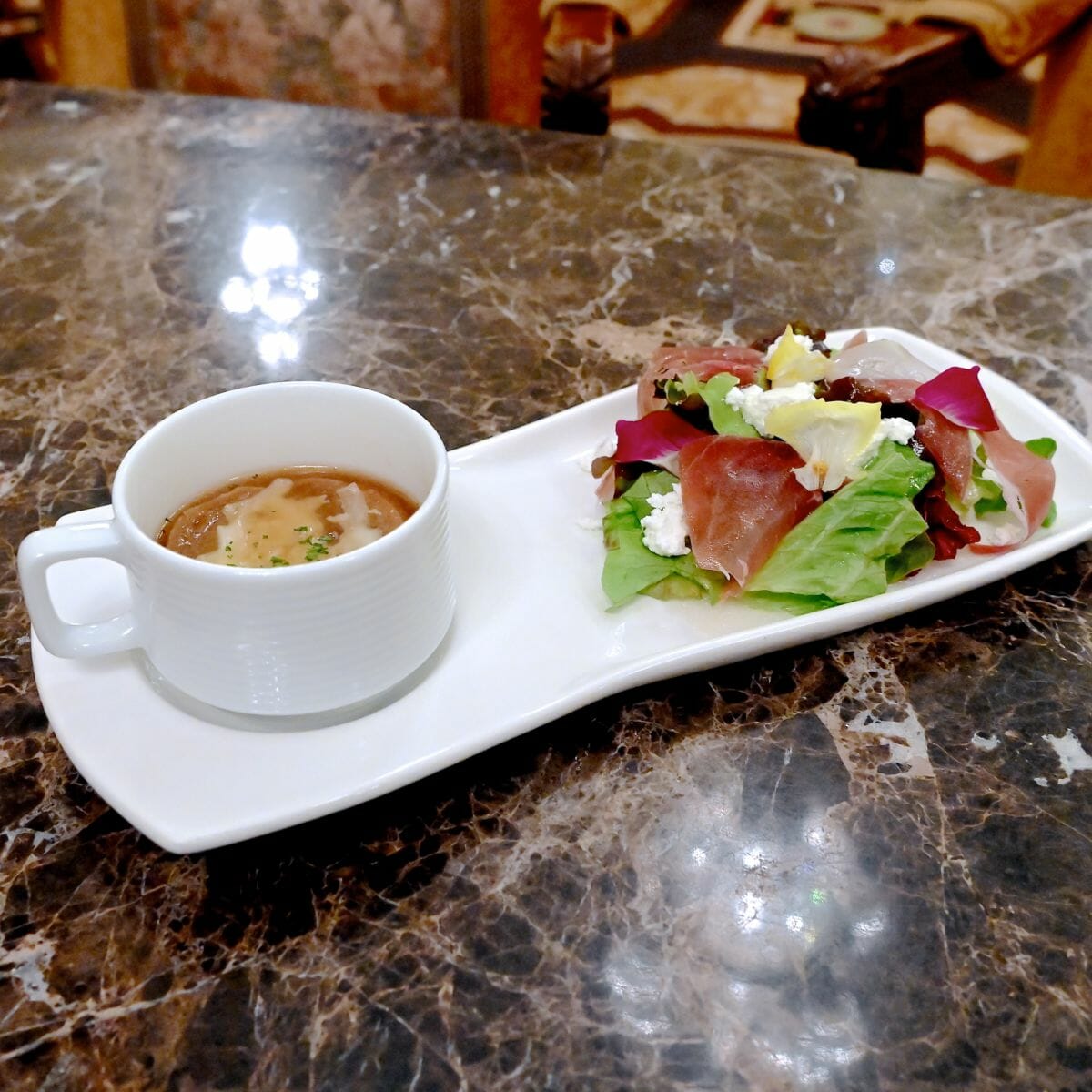 生ハムとカッテージチーズのサラダとオニオンスープ