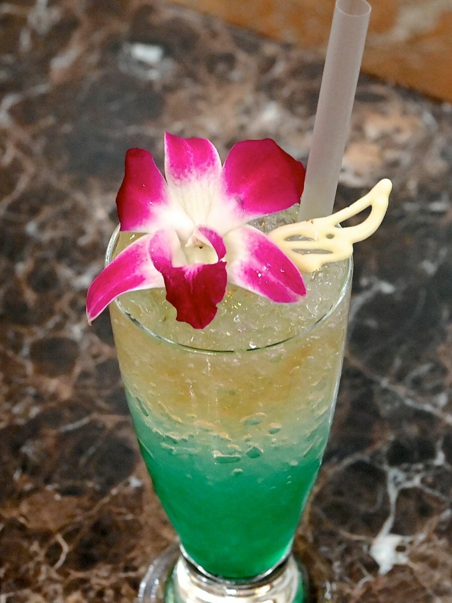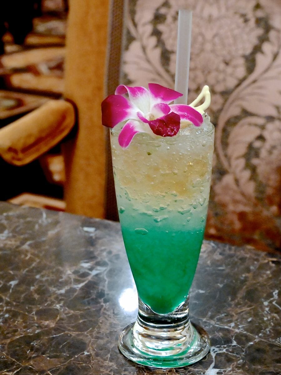 マンゴージュース、グリーンアップルシロップ、ブルーシロップ、マスカットゼリー、クラブソーダ入りの爽やかなドリンク。