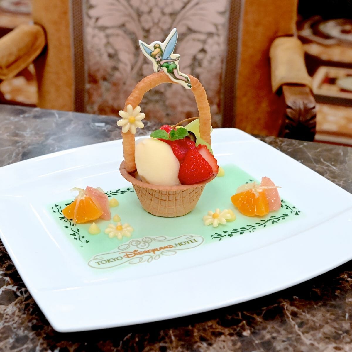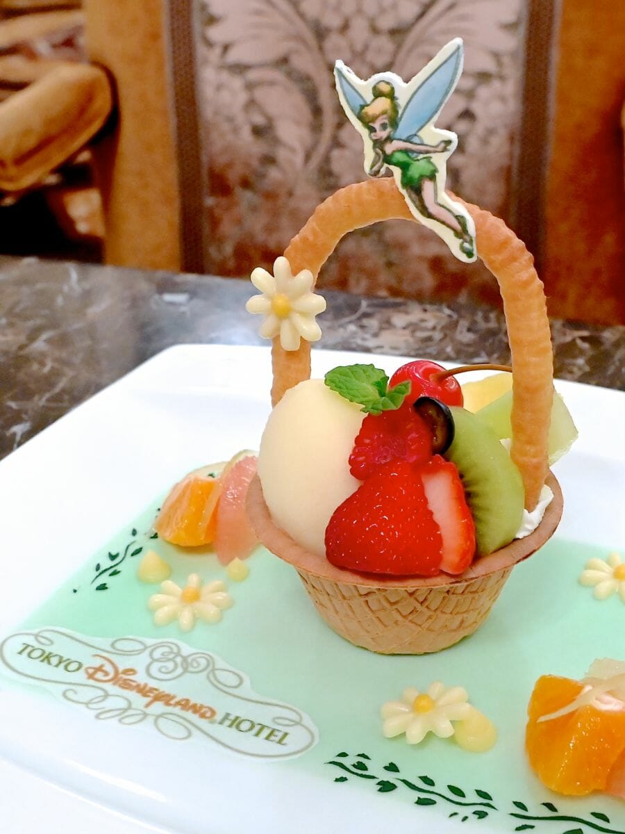 デザートは、華やかなカゴに寄ってきたティンカーベルをイメージした「デコポンソルべとヨーグルトアイスのパフェ 季節のフルーツ」☆
