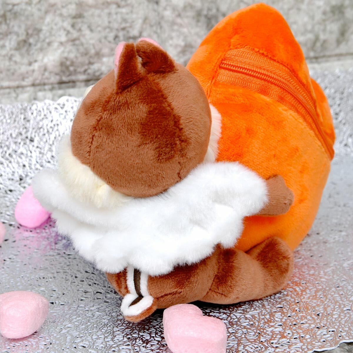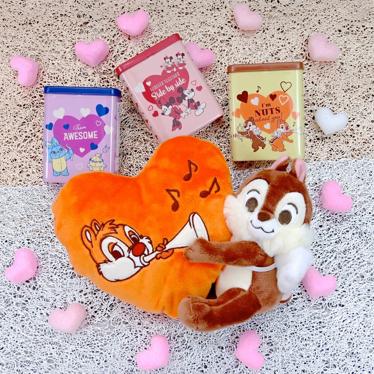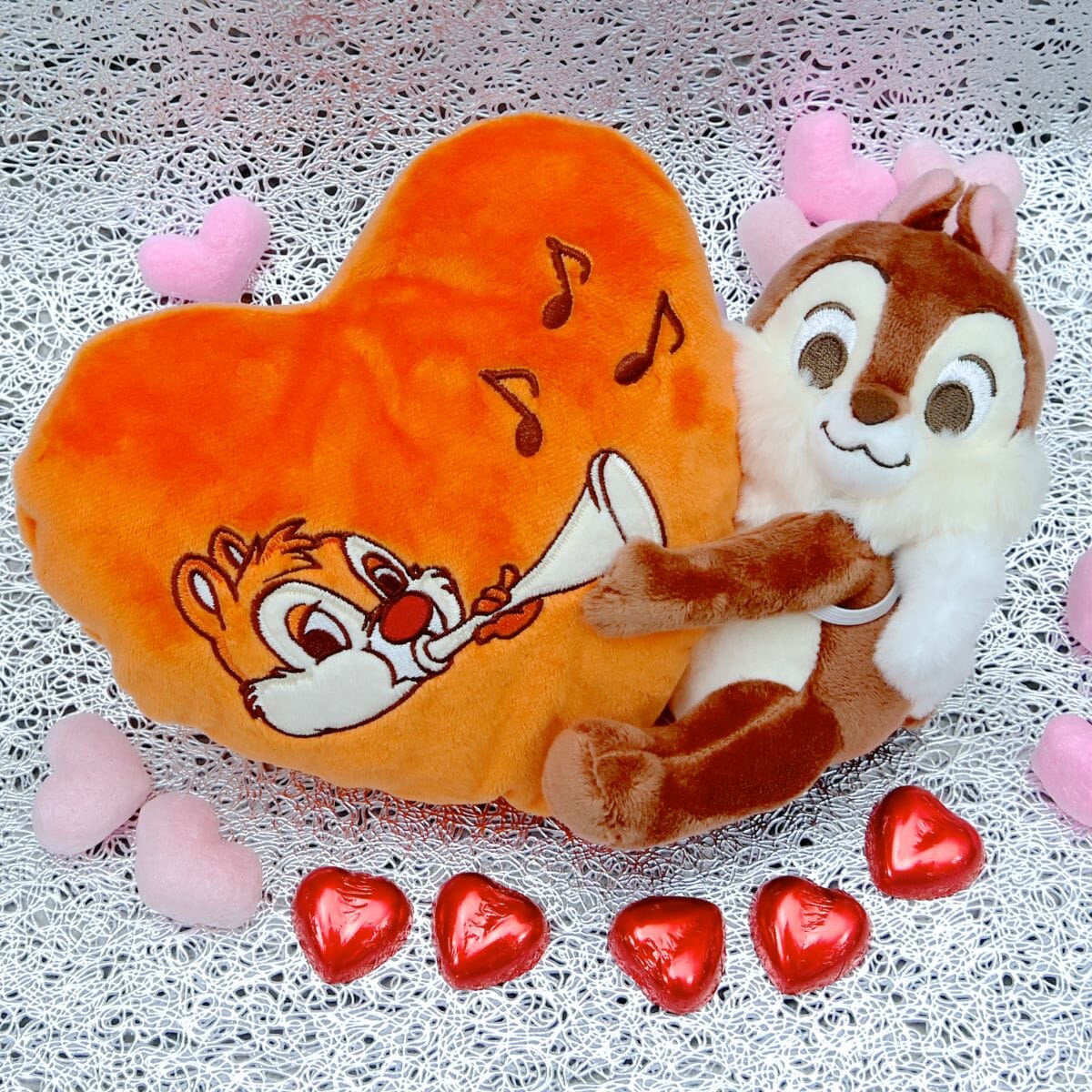 キューピッドにように背中に翼をつけた「チップ」のぬいぐるみと、ラッパを吹く「デール」が刺しゅうされたふんわり大きなハート型のポーチ付き☆