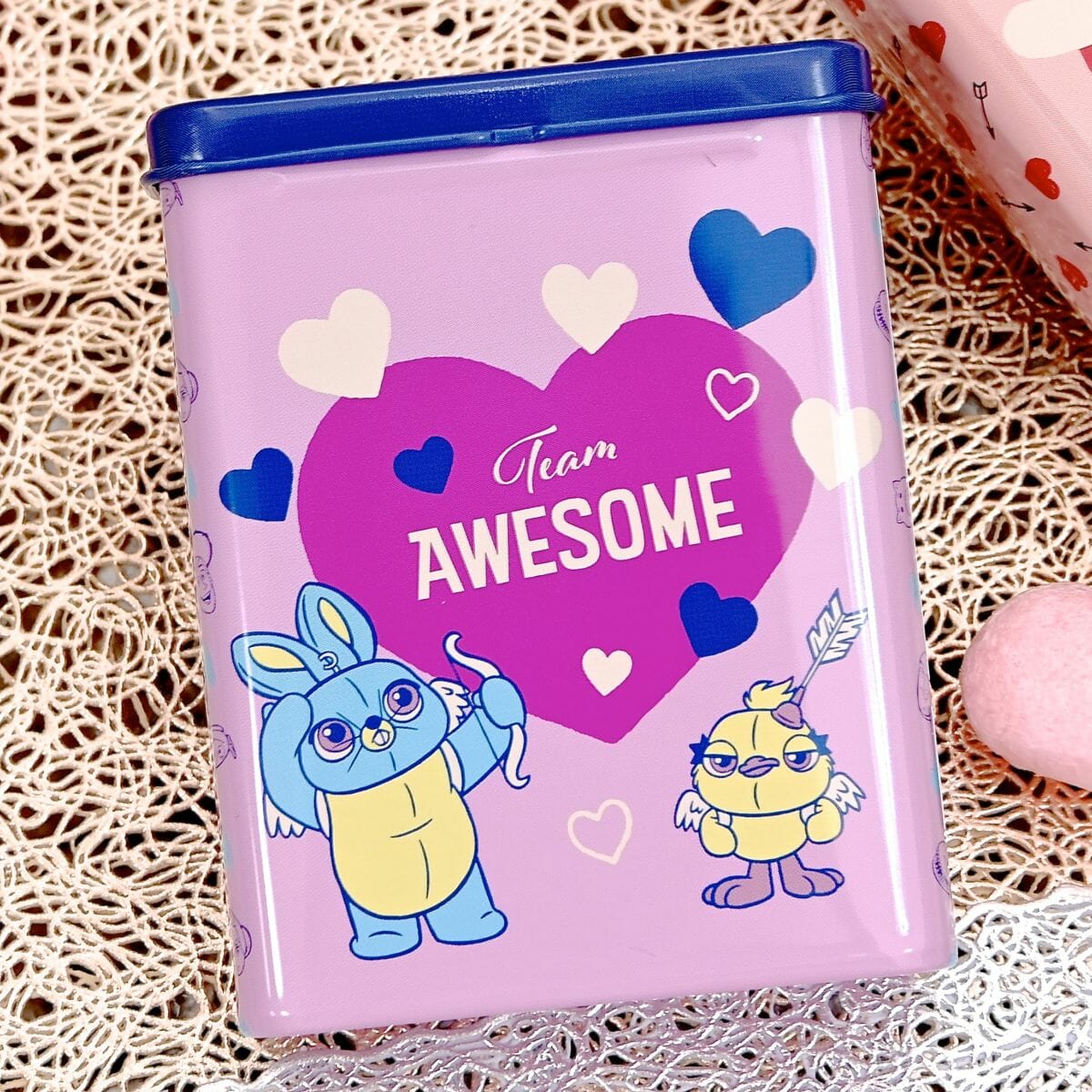 ディズニー&ピクサー映画『トイ・ストーリー4』に登場した「ダッキー」と「バニー」がデザインされた紫色の缶入りチョコレート。