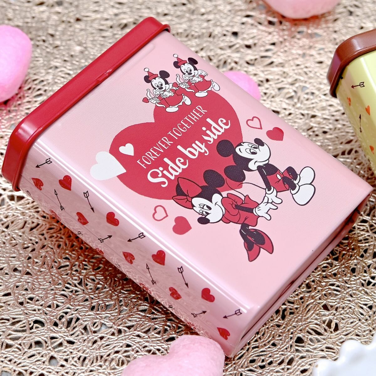 ラブラブなミッキーマウスとミニーマウス、ハートの屋を持ったモーティーとフェルディたちがデザインされたピンクの缶入りチョコレート☆