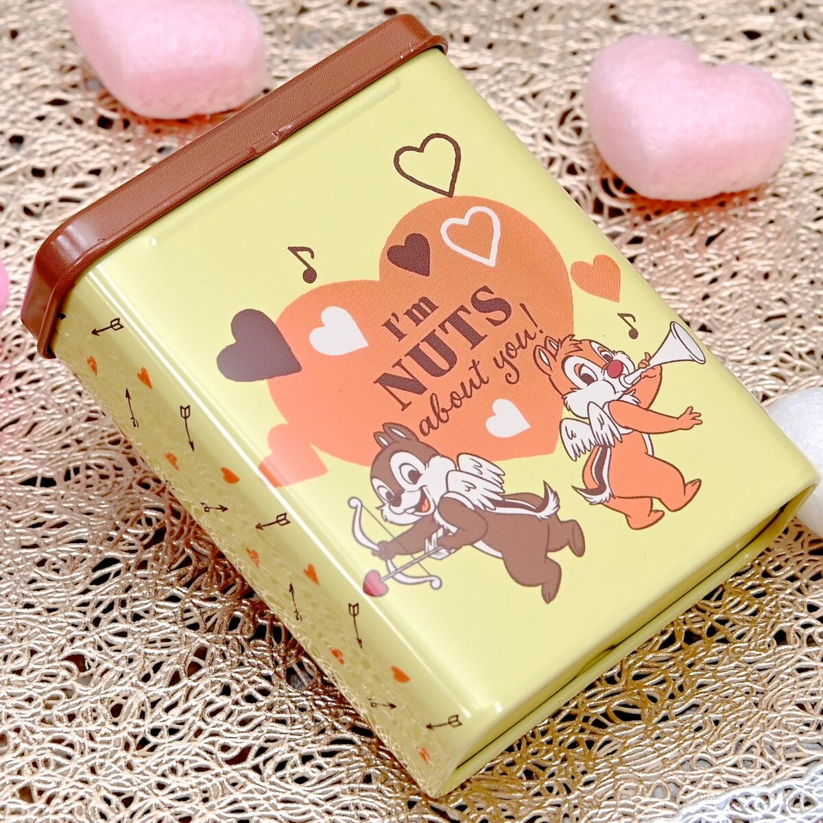背中に翼をつけたエンジェルのような「チップ」と「デール」がデザインされた、黄色の缶入りチョコレート。