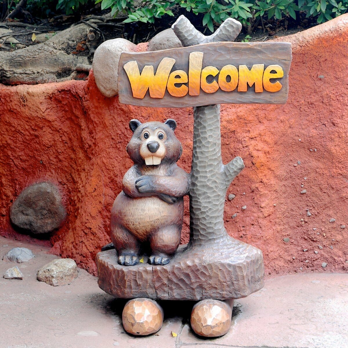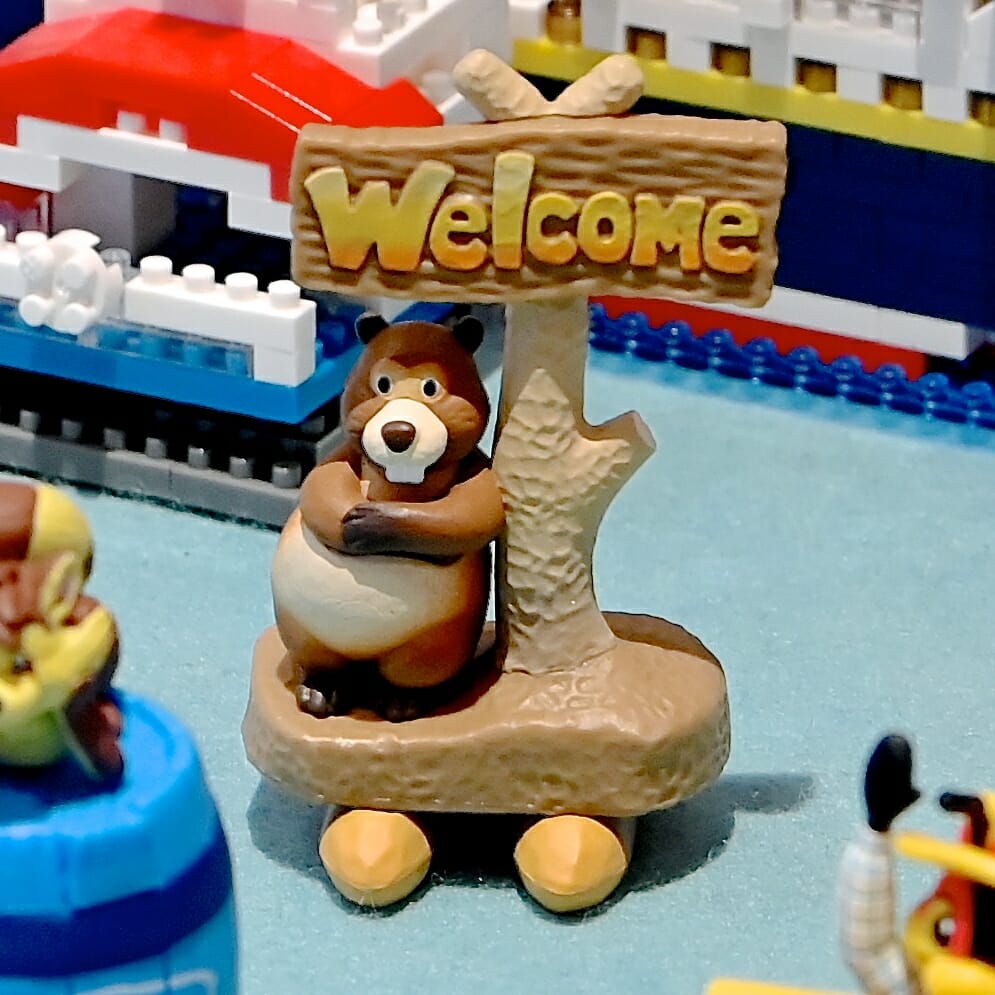 クリッターカントリー入り口付近にあるWelcomeと書かれた看板とビーバーが再現されたフィギュア。