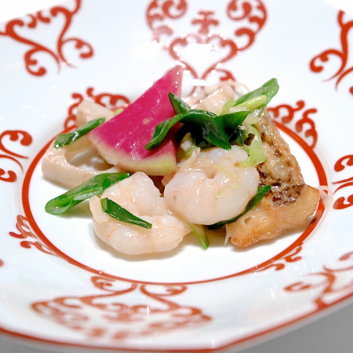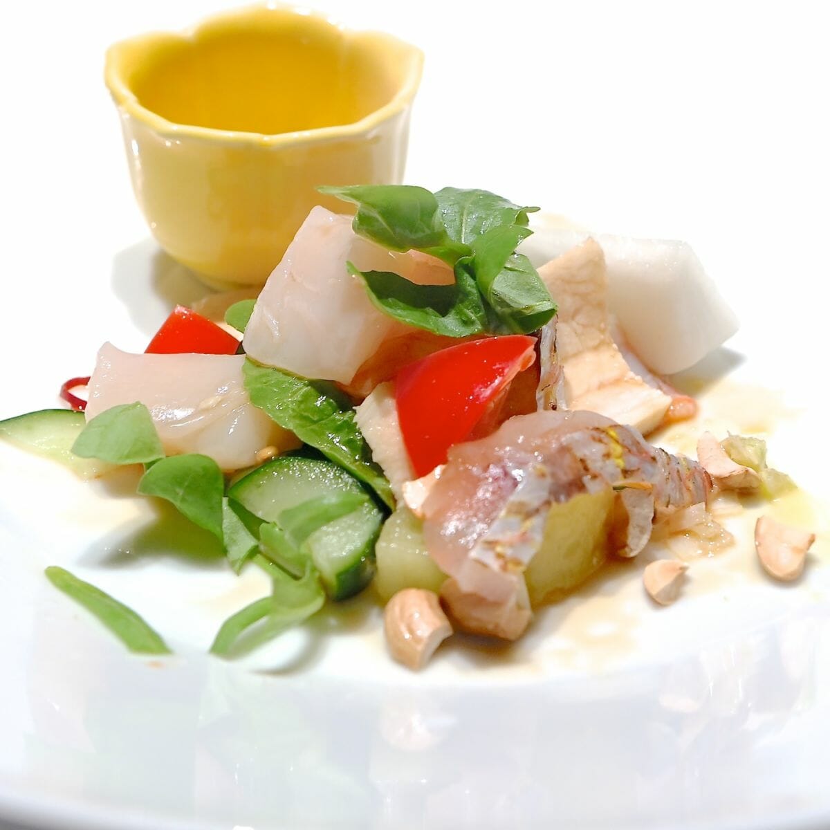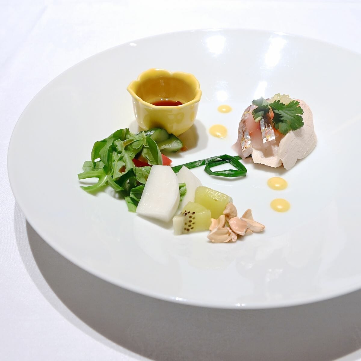 前菜は、イトヨリダイ、エビ、蒸し鶏、ホタテや、ナッツ、キウイ、カブ、ほうれん草、トマトなど様々な食材がいただけるサラダ。
