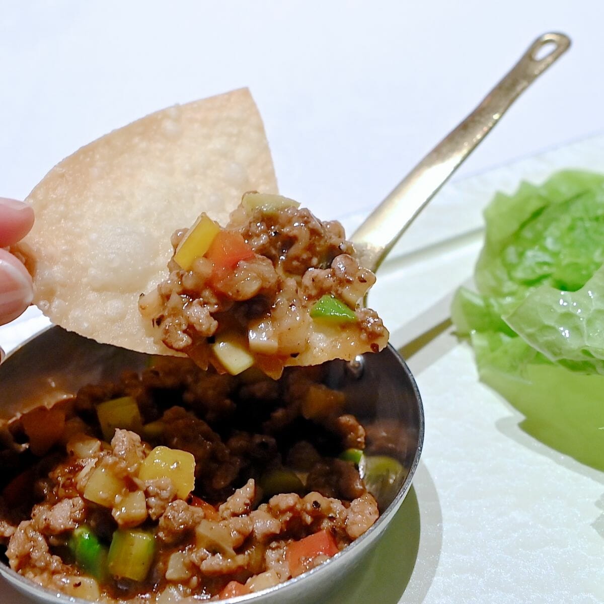 ブラックペッパーがほどよく効いた牛ひき肉とカラフルな野菜入りのソースを、