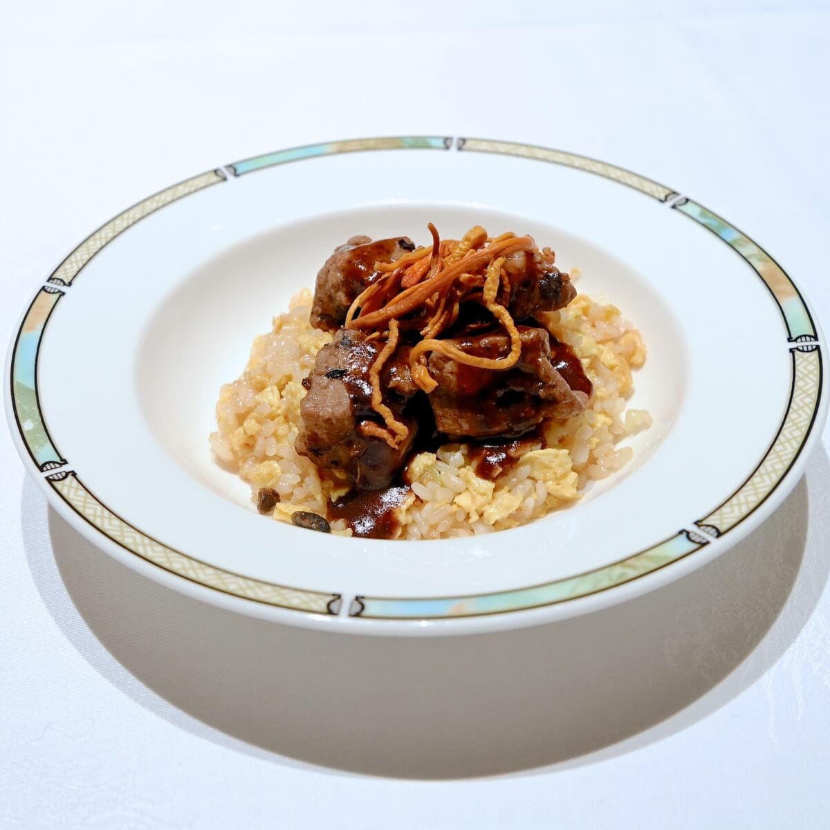 せいろ蒸しにしたやわらかな豚肉と味噌の効いた豆チ醤ソース、きのこがトッピングされた炒飯。