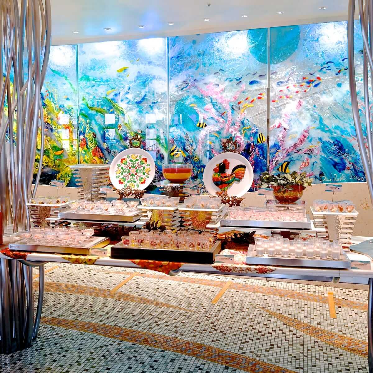スペインの伝統工芸品、セビリア焼きの飾り絵皿などがデコレーションされたブッフェ台にはカップ入りの冷製料理が並べられています☆