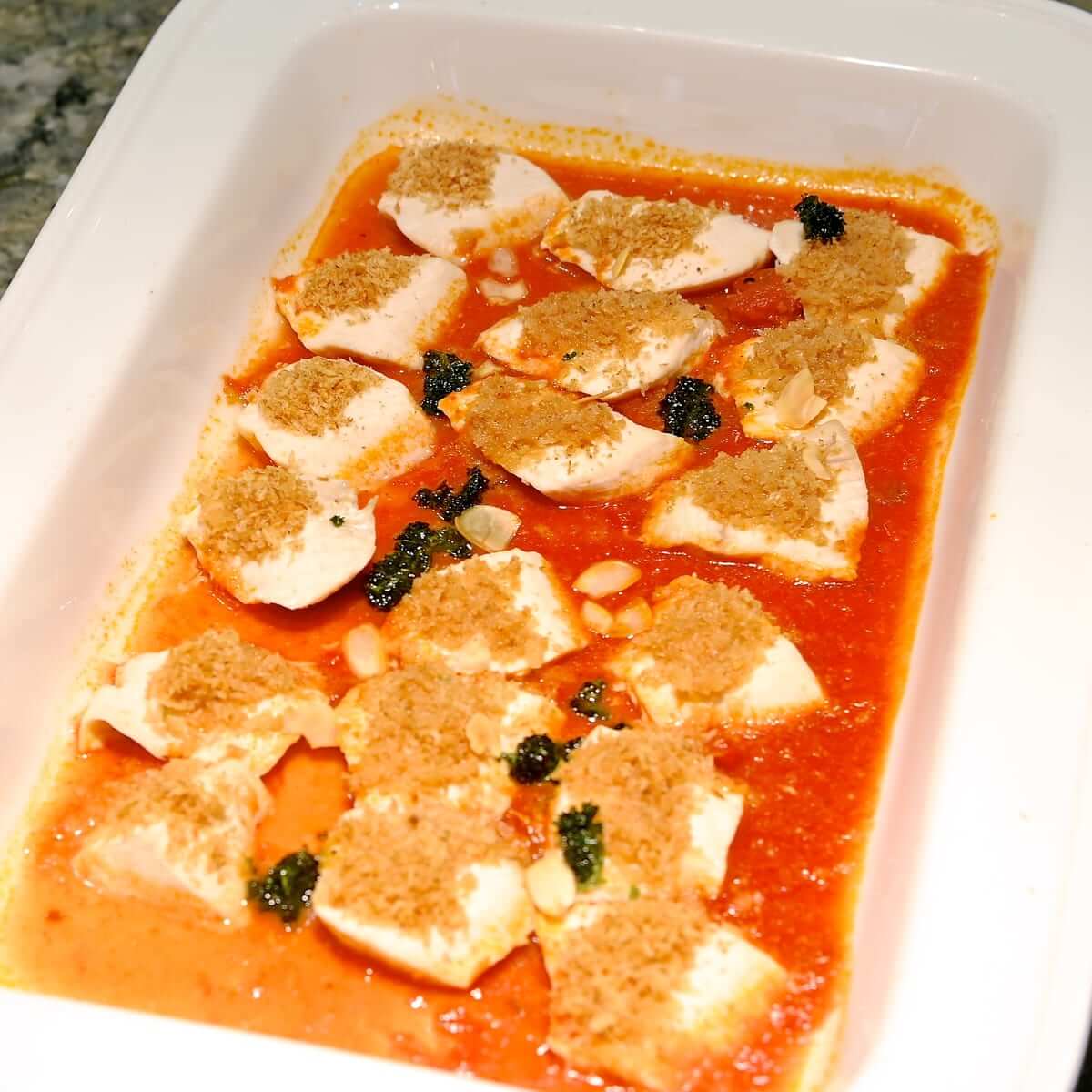 トマトソース、香草パン粉の風味が効いたメカジキ。