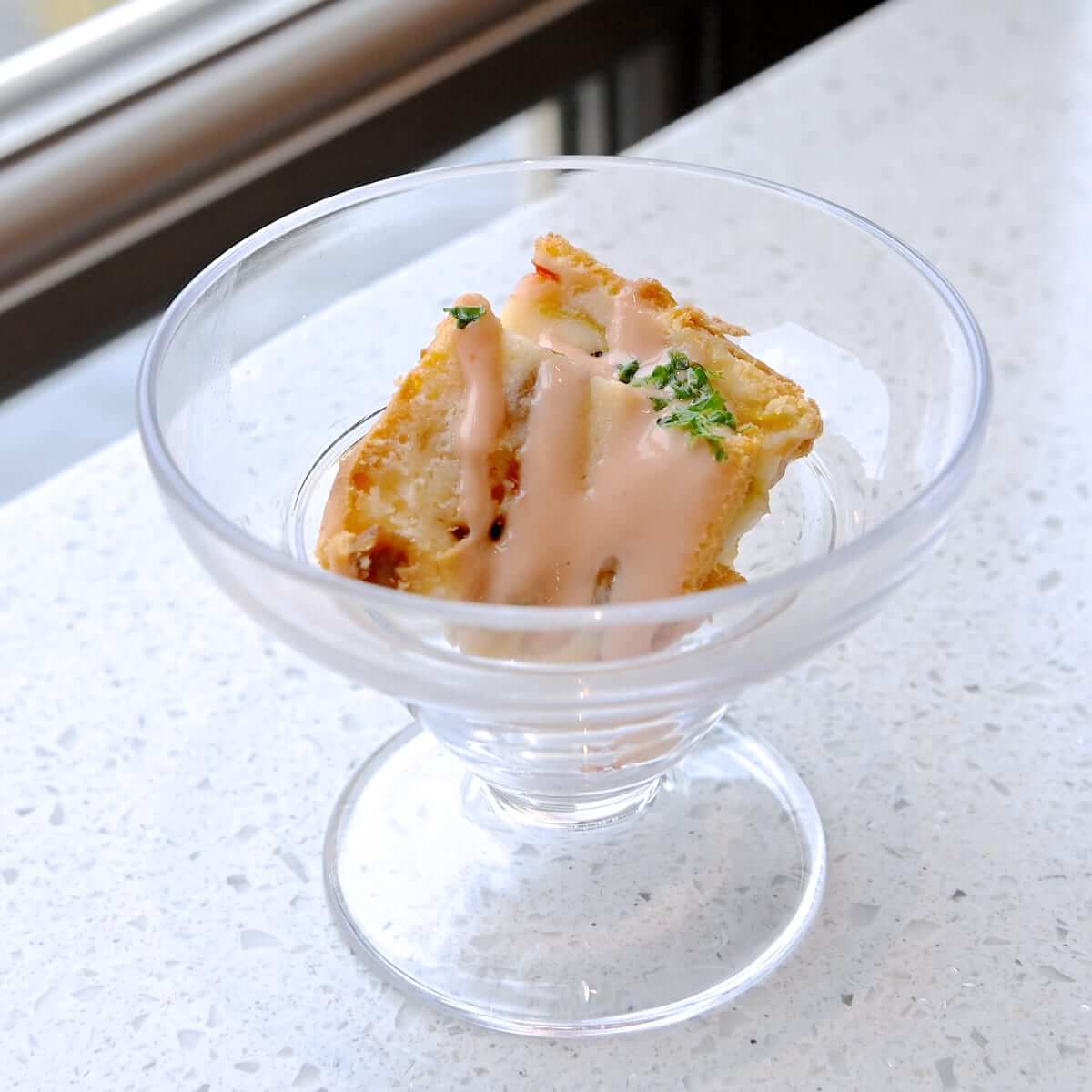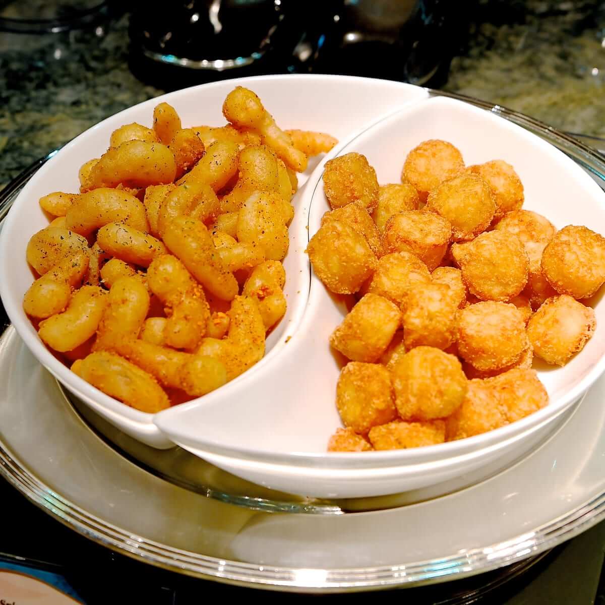 スパイシーな味付けのシュリンプナゲットとハッシュドポテト。
