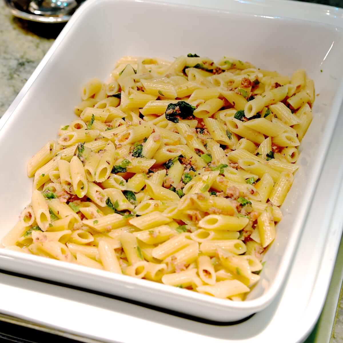 細かく刻んだタコと野菜のソースでいただくパスタ。