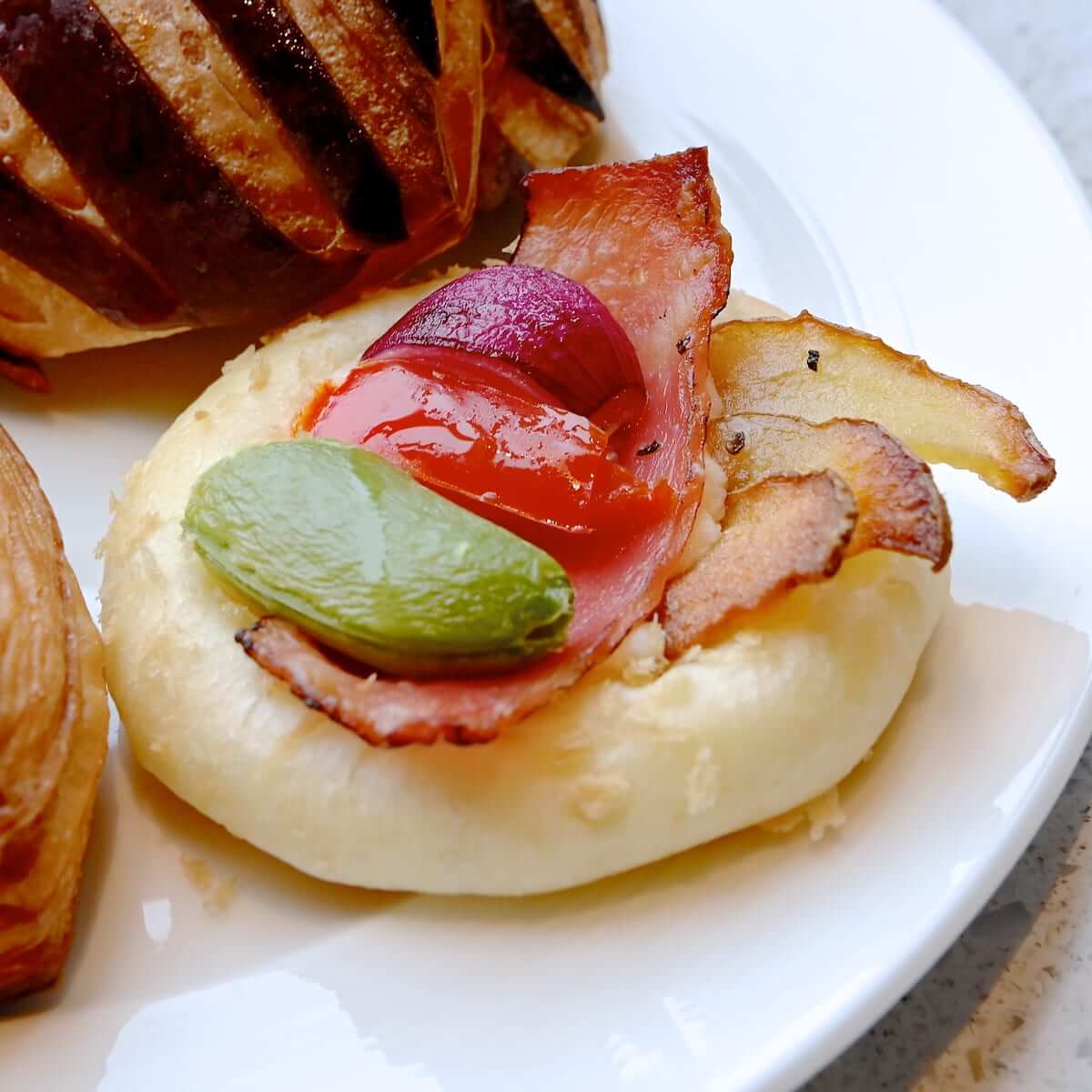 彩りのよいベジタブルとベーコンのパン。