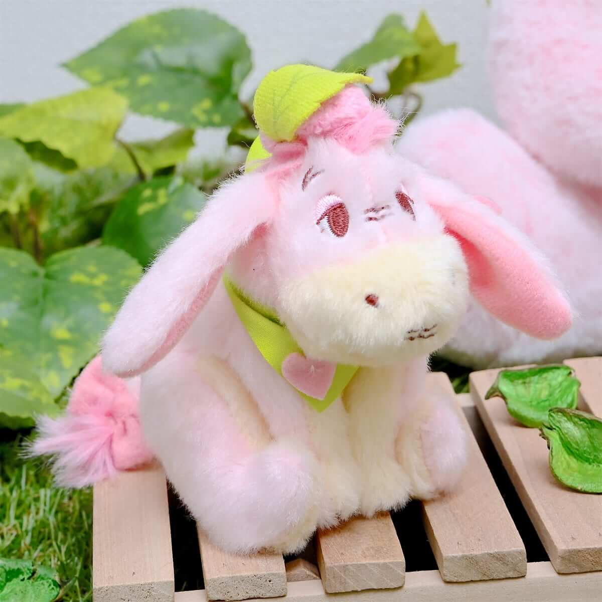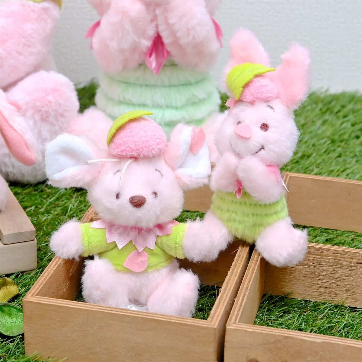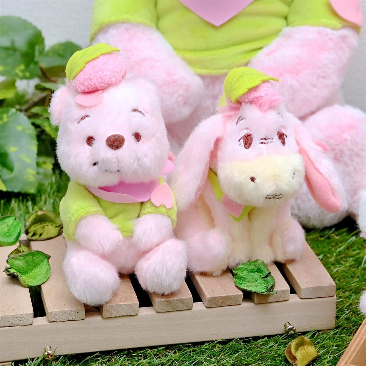 ふんわりサクラ色に染まったくまのプーさんたちのぬいぐるみ&ぬいぐるみキーチェーン。