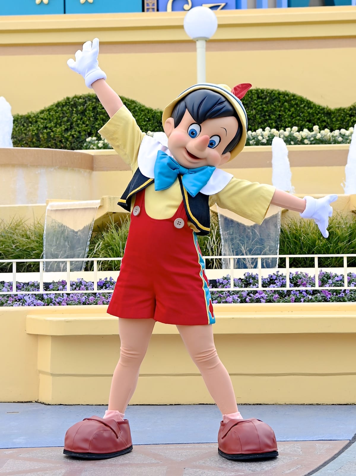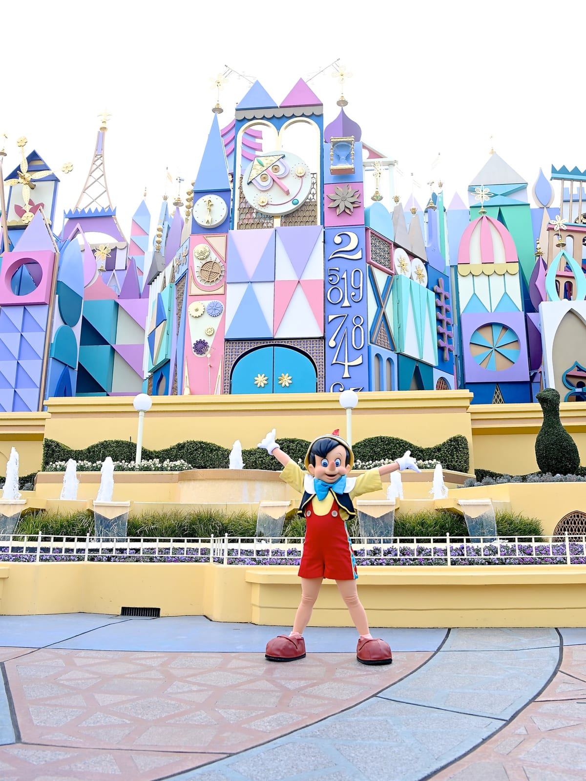 アトラクション「イッツ・ア・スモールワールド」前で大きくポーズをとってくれたピノキオ。