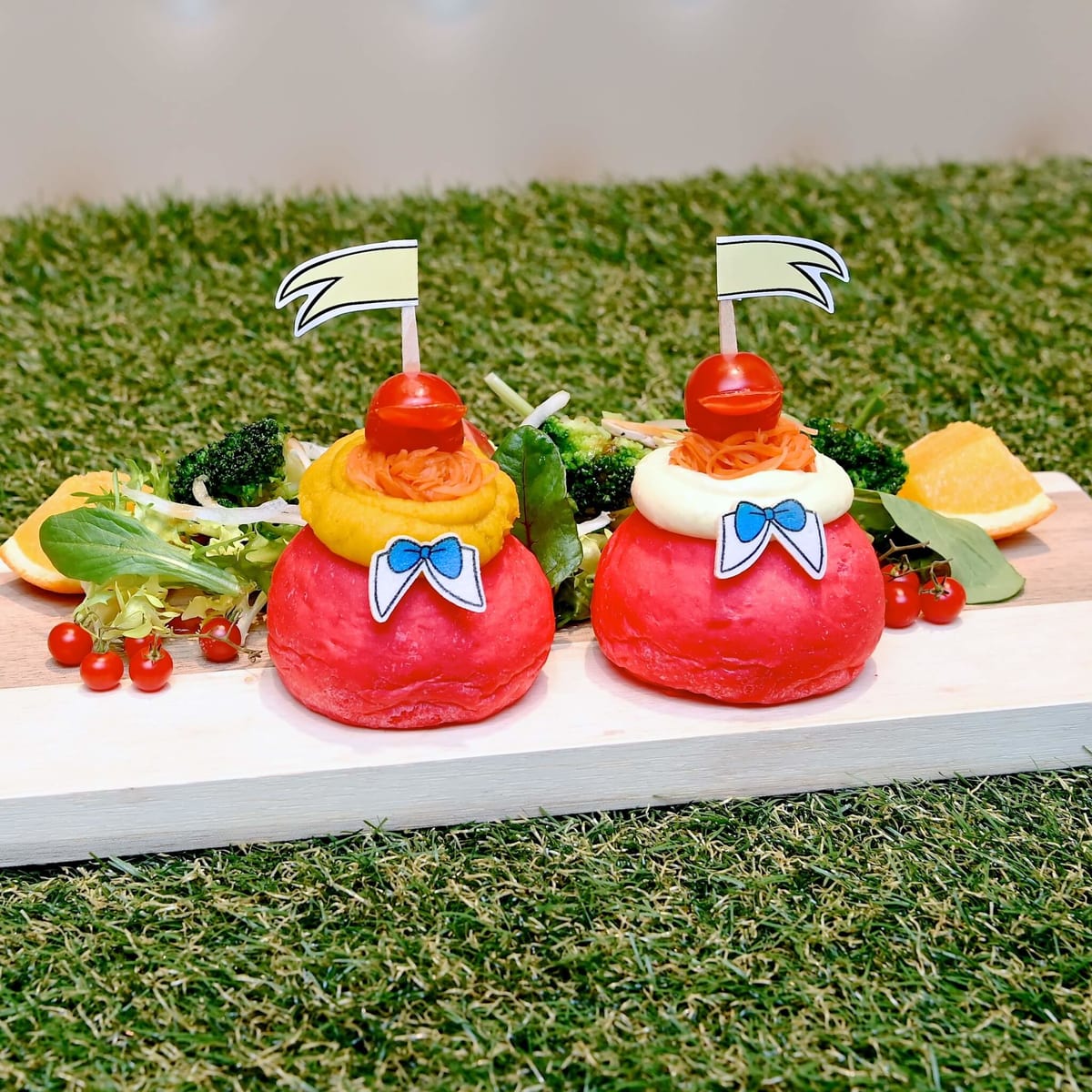 「アリス」の邪魔ばかりするおかしな双子「トゥイードルダムとトゥイードルディー」をイメージしたカラフルなサンドウィッチプレート。