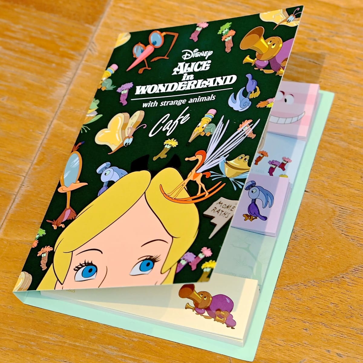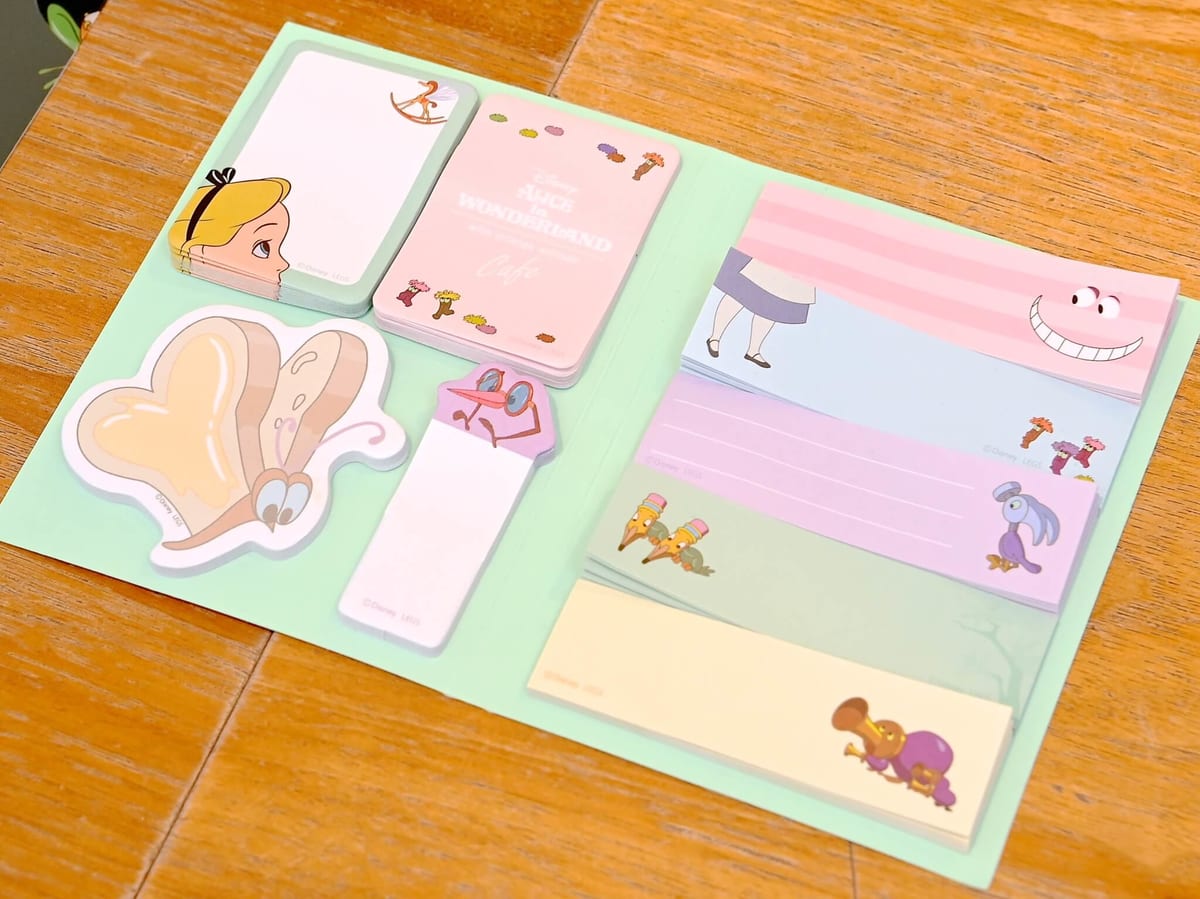 アリスやチェシャ猫、ふしぎな生き物たちの付箋がセットされています☆