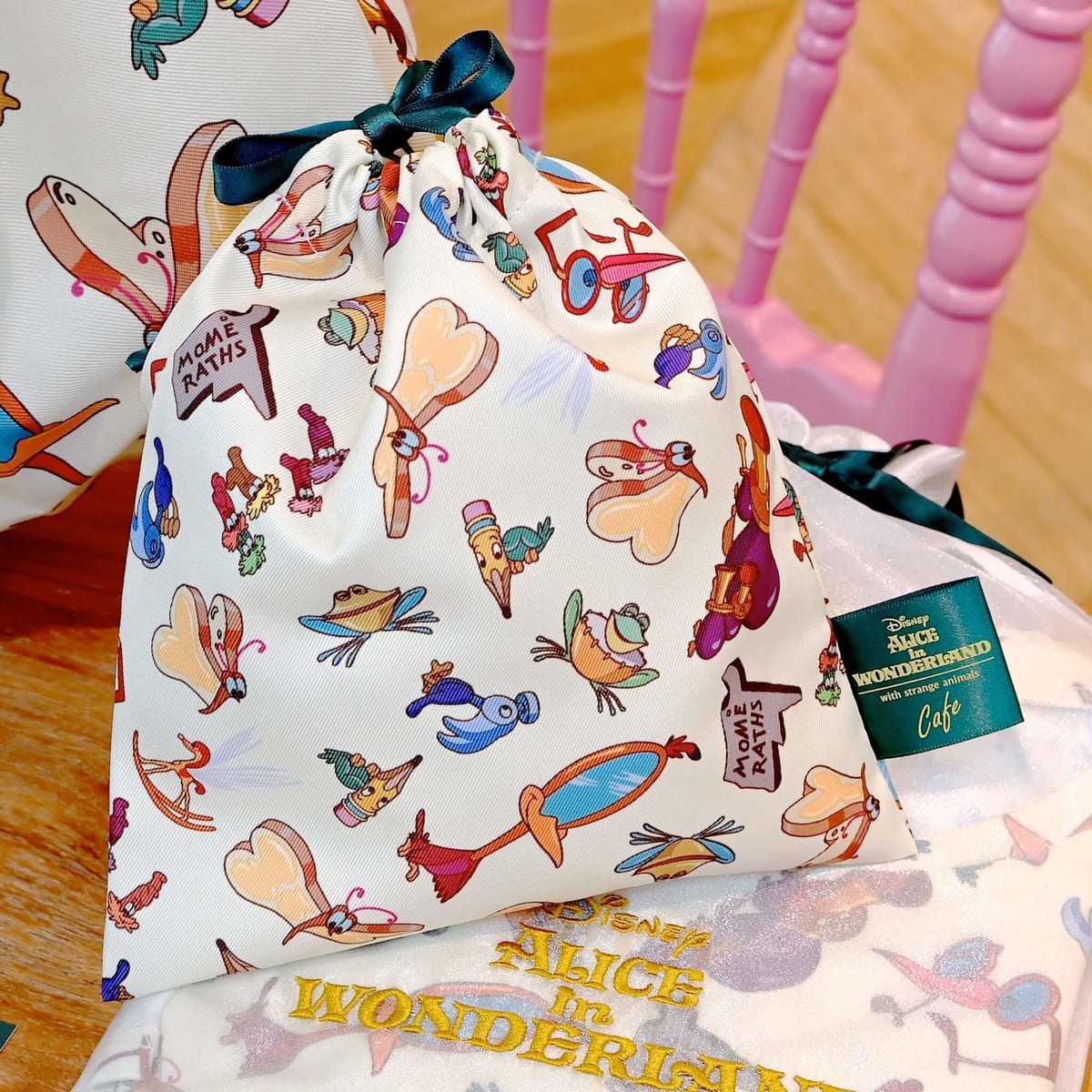 ふしぎな生き物たちとアリスがデザインされた総柄アートの「クリーム」と「アリス」の足元とモメラスたちをアップにした「ダークグリーン」の2色☆