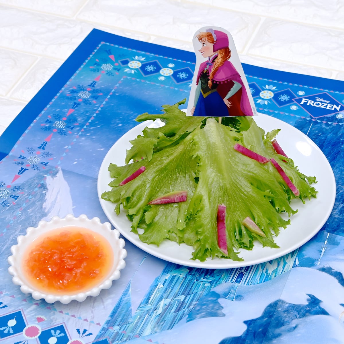 右側のアートを切りとってつまようじに付けると、サラダがまるでスカートのようになる
