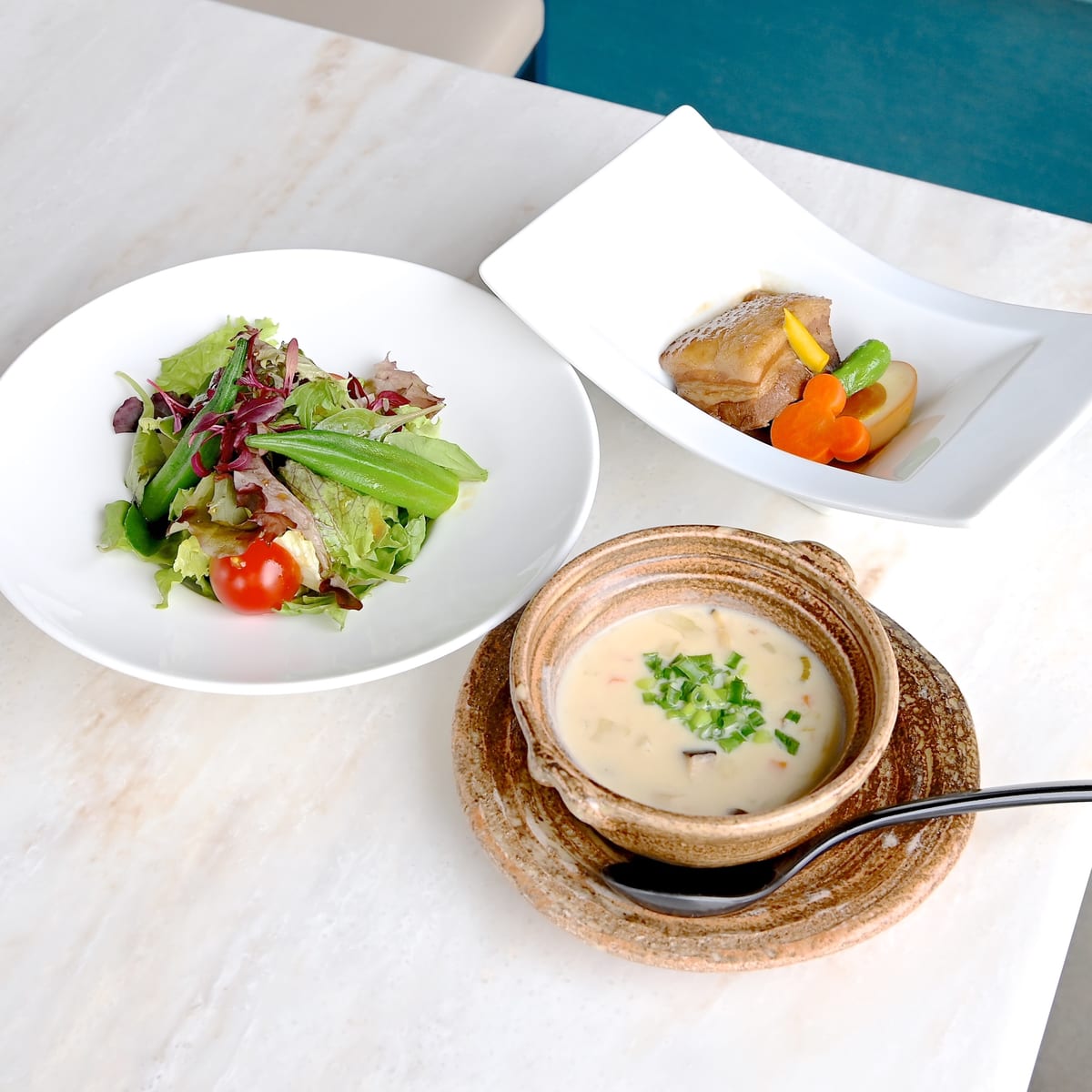 一品料理は、味噌クラムチャウダー、ガーデンサラダ、豚の角煮。